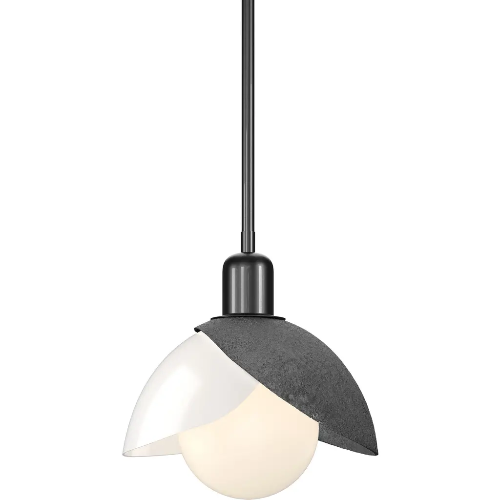 A larger single pendant, the Brooklyn Medium Double Shade Art GlassMini Pendant features the Brooklyn's hallmark forged and textured steel shadethat is uniquely paired with a contrasting white art glass shade to brilliant effect,with its exposed bulb that is nestled within the shades.