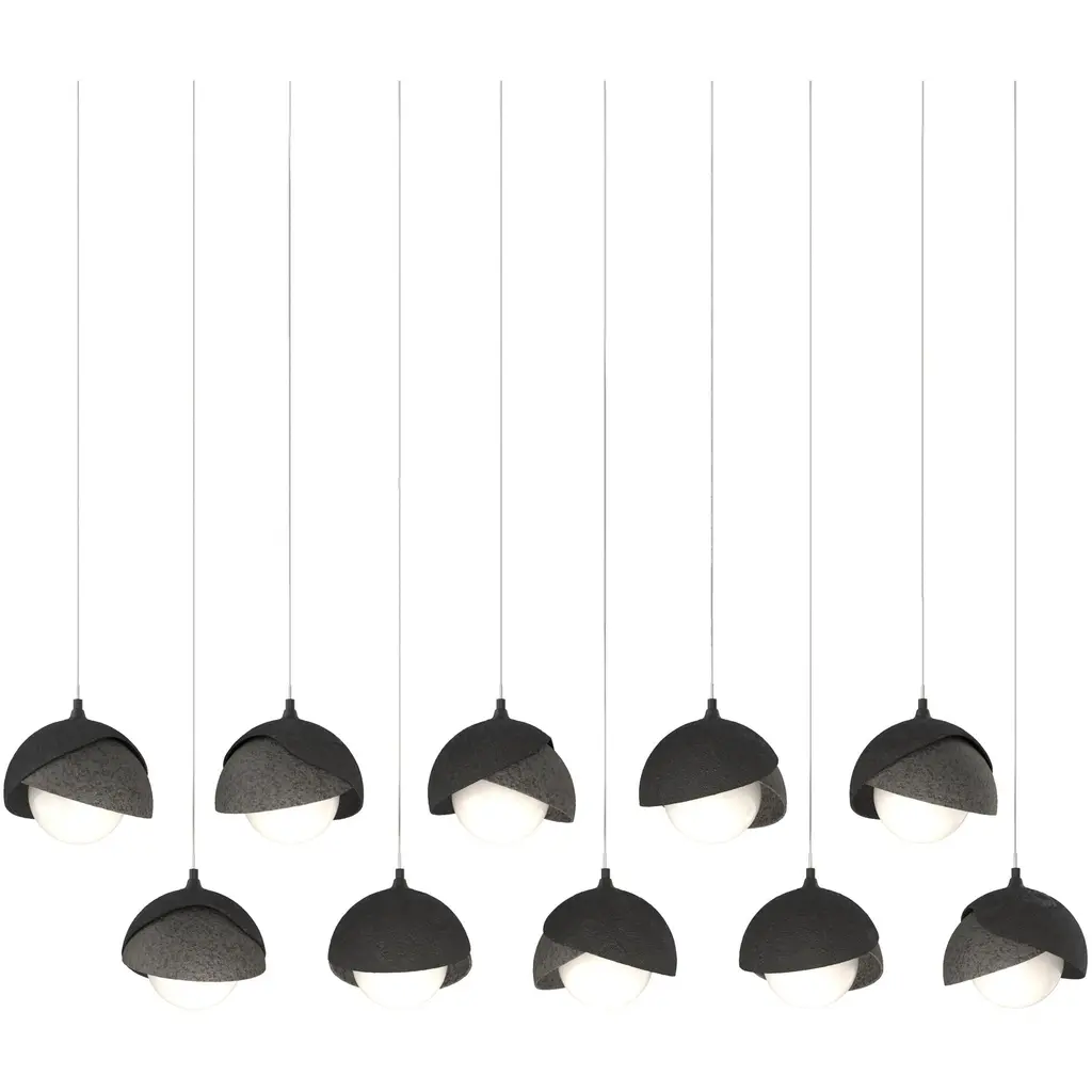 The Brooklyn Collection features fixtures in many sizes and formats, including this large 10-Light Double Shaded linear version. With its rectangular pendant above, ten individual pendants can be aligned or staggered to suit the design at customizable heights on each cable. The Brooklyn Double Shade is available as a two-tone option, with shades that can be in contrasting finishes, if desired. Vermont artisans hand-forge and texture each shade. Available in any standard finish.