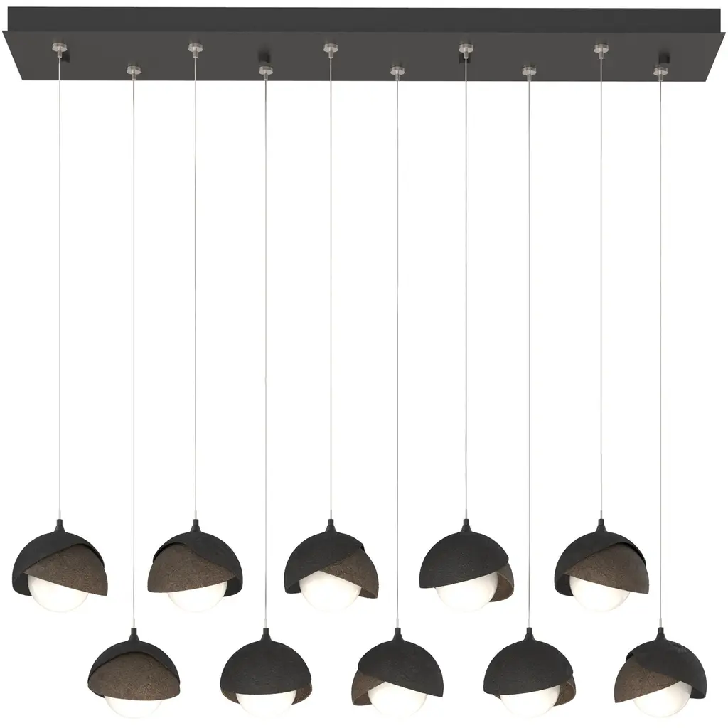 The Brooklyn Collection features fixtures in many sizes and formats, including this large 10-Light Double Shaded linear version. With its rectangular pendant above, ten individual pendants can be aligned or staggered to suit the design at customizable heights on each cable. The Brooklyn Double Shade is available as a two-tone option, with shades that can be in contrasting finishes, if desired. Vermont artisans hand-forge and texture each shade. Available in any standard finish.