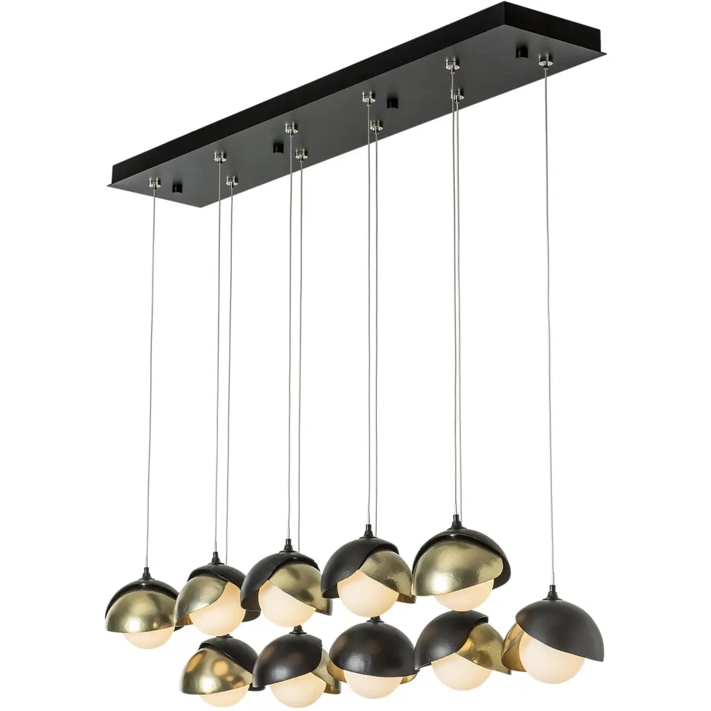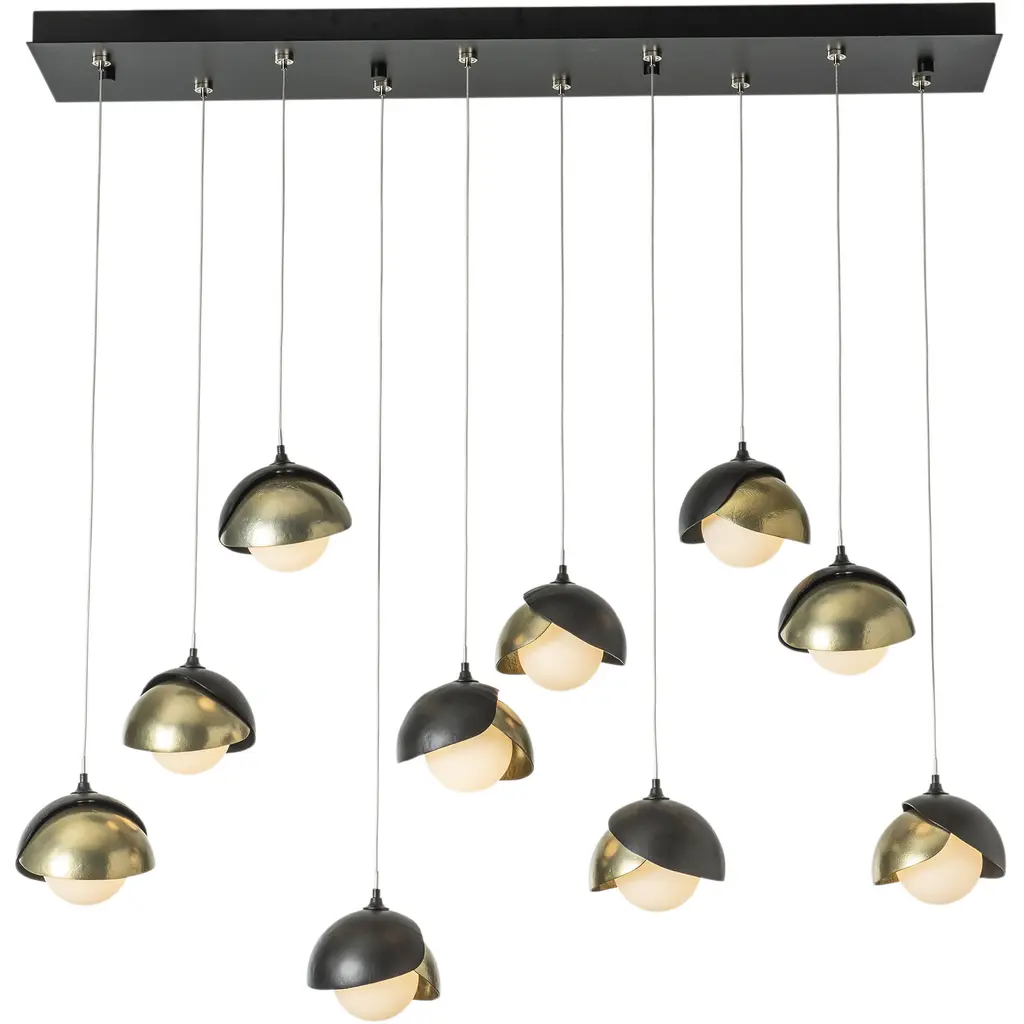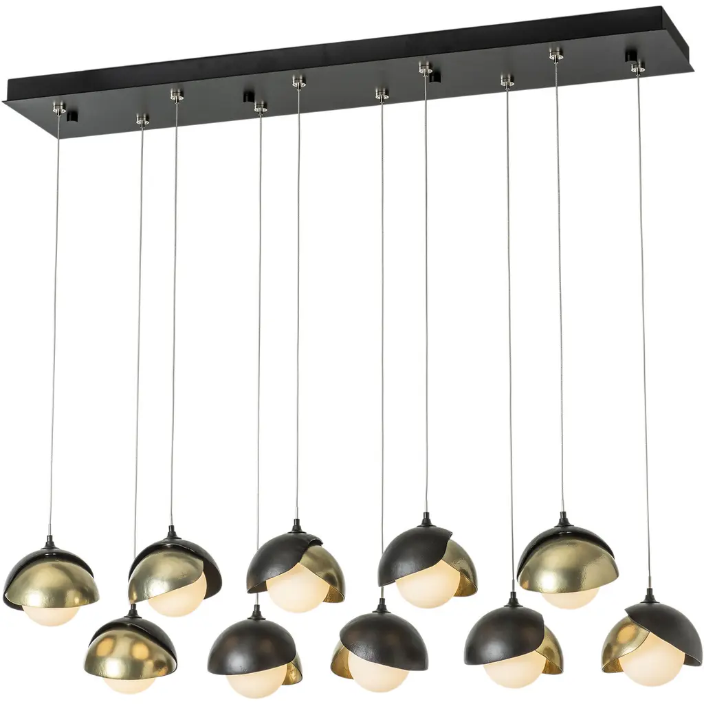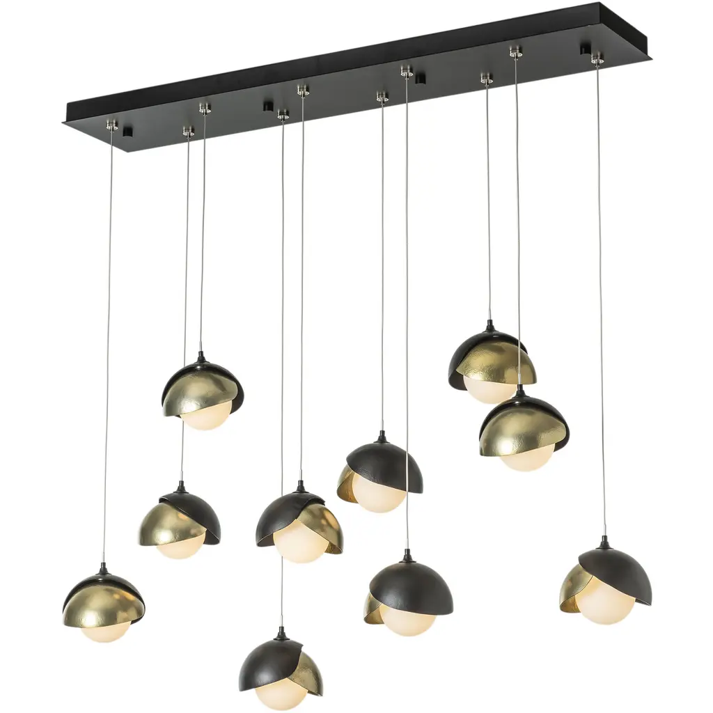 The Brooklyn Collection features fixtures in many sizes and formats, including this large 10-Light Double Shaded linear version. With its rectangular pendant above, ten individual pendants can be aligned or staggered to suit the design at customizable heights on each cable. The Brooklyn Double Shade is available as a two-tone option, with shades that can be in contrasting finishes, if desired. Vermont artisans hand-forge and texture each shade. Available in any standard finish.