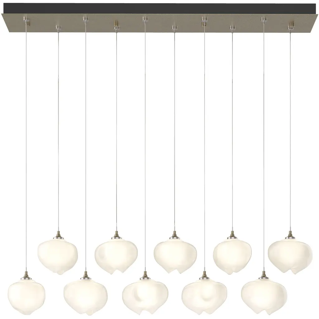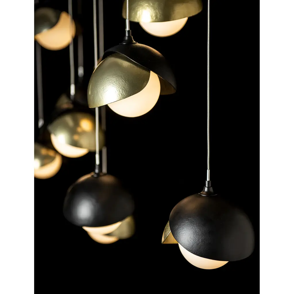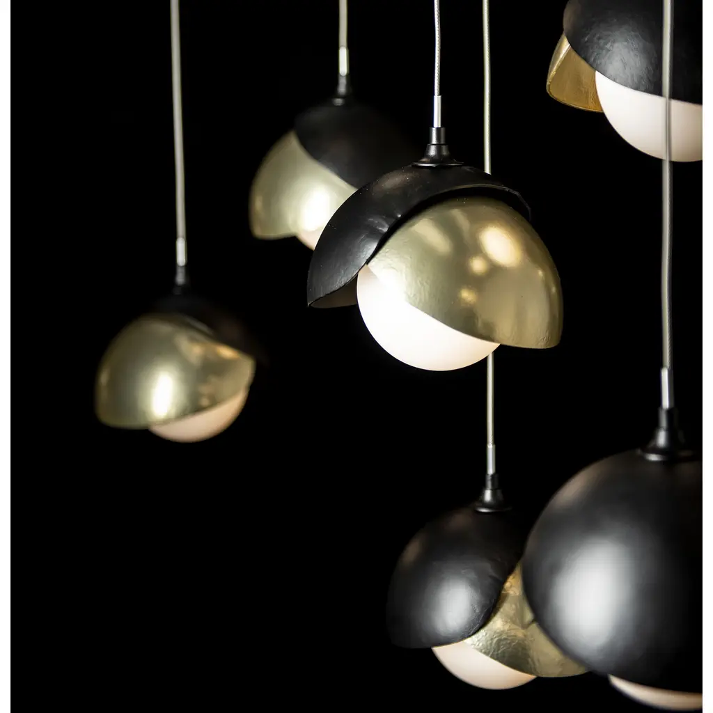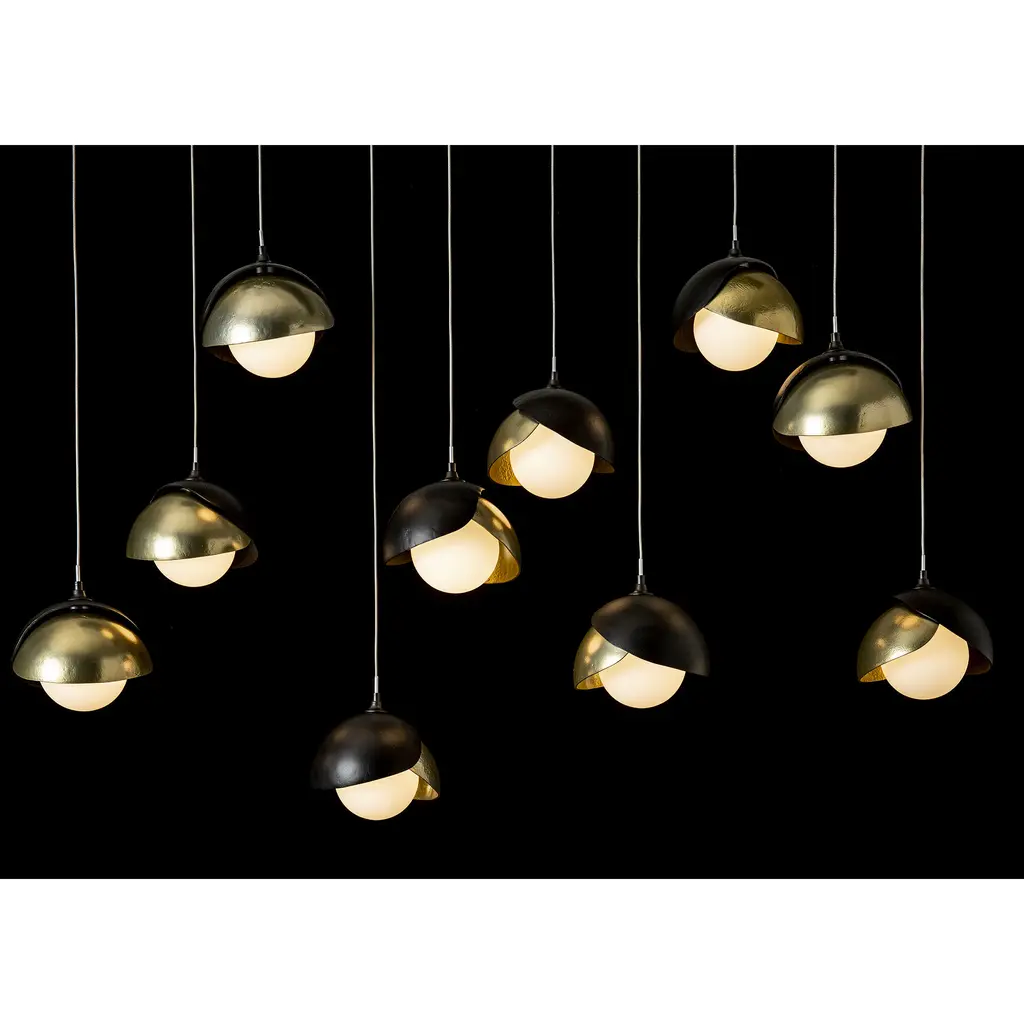 The Brooklyn Collection features fixtures in many sizes and formats, including this large 10-Light Double Shaded linear version. With its rectangular pendant above, ten individual pendants can be aligned or staggered to suit the design at customizable heights on each cable. The Brooklyn Double Shade is available as a two-tone option, with shades that can be in contrasting finishes, if desired. Vermont artisans hand-forge and texture each shade. Available in any standard finish.