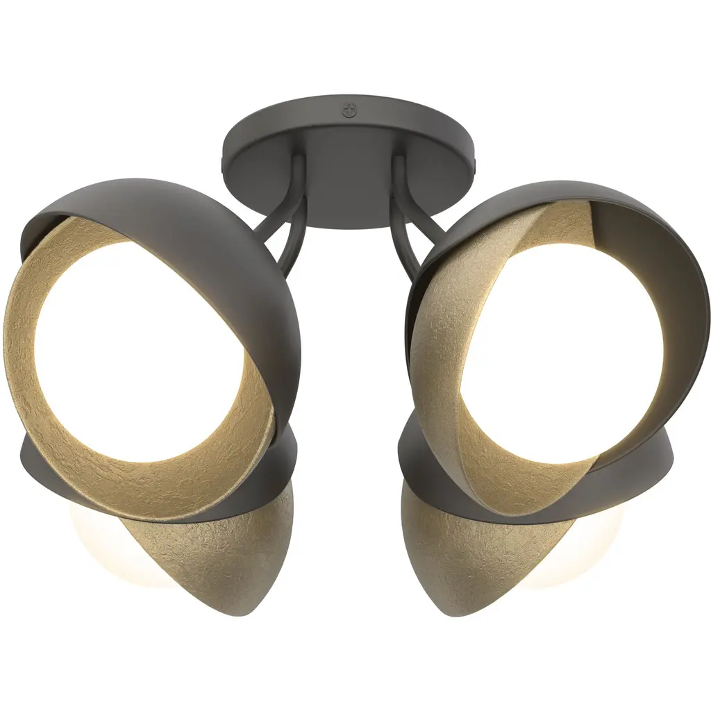 Do you see lids or the revealing petals of a flower? The Brooklyn 4-Light Double Shade Semi-Flushmount by Hubbardton Forge leaves much to the imagination. Our artisans took whimsy to the next level, making a double lid-like shade the center point of this clustered semi-flushmount light. A unique, forged-steel double shade sits at the end of each short rod, curved slightly outward, extending up to a slim circular base and extending down to a single globe. Mount this four-light semi-flushmount fixture in your bedroom, hallway, or pantry closet.