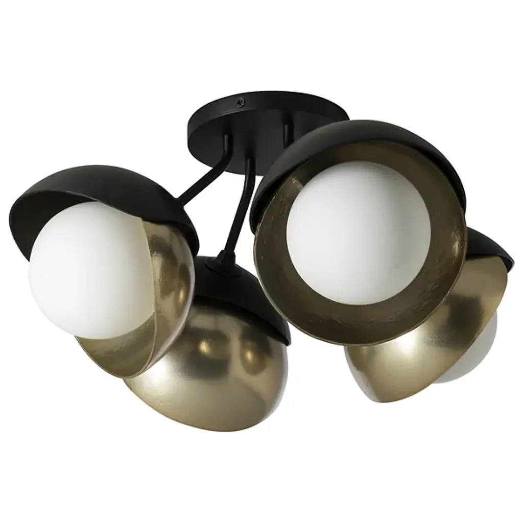 Do you see lids or the revealing petals of a flower? The Brooklyn 4-Light Double Shade Semi-Flushmount by Hubbardton Forge leaves much to the imagination. Our artisans took whimsy to the next level, making a double lid-like shade the center point of this clustered semi-flushmount light. A unique, forged-steel double shade sits at the end of each short rod, curved slightly outward, extending up to a slim circular base and extending down to a single globe. Mount this four-light semi-flushmount fixture in your bedroom, hallway, or pantry closet.