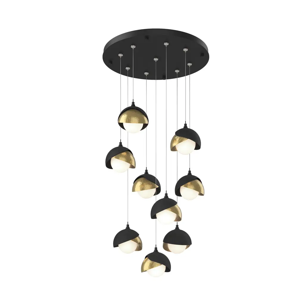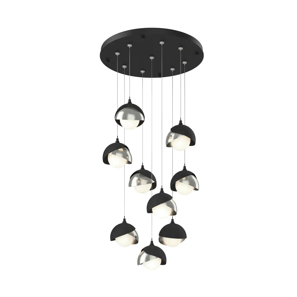 The Brooklyn 5-Light multi-port chandelier is available with a two-tone design, offering the opportunity for contrasting finishes for Brooklyn's double shades. Shades are forged and handcrafted by Vermont makers, with the trademark texturing visible in the metal. Available in all standard finishes, Brooklyn 5-Light pendants can be custom-staggered on its round canopy to perfectly fill the space.