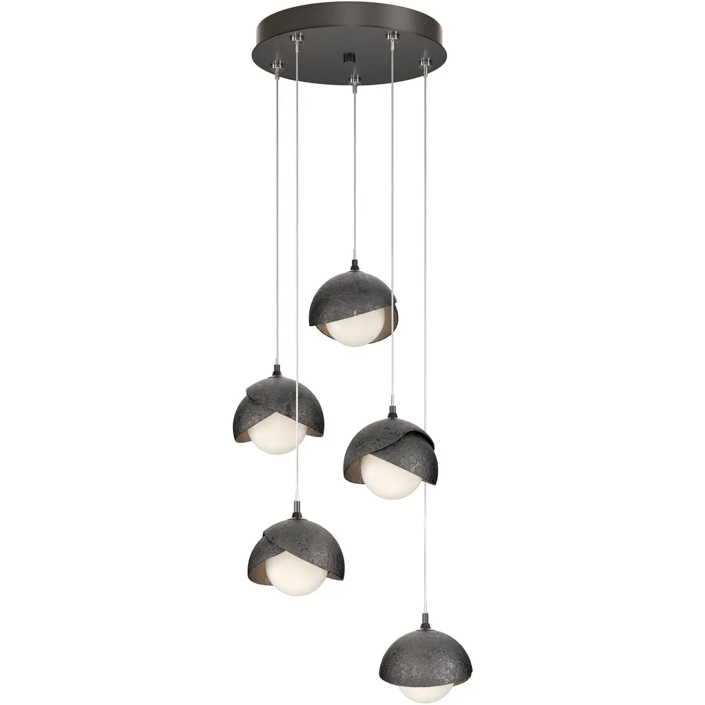 The Brooklyn 5-Light multi-port chandelier is available with a two-tone design, offering the opportunity for contrasting finishes for Brooklyn's double shades. Shades are forged and handcrafted by Vermont makers, with the trademark texturing visible in the metal. Available in all standard finishes, Brooklyn 5-Light pendants can be custom-staggered on its round canopy to perfectly fill the space.