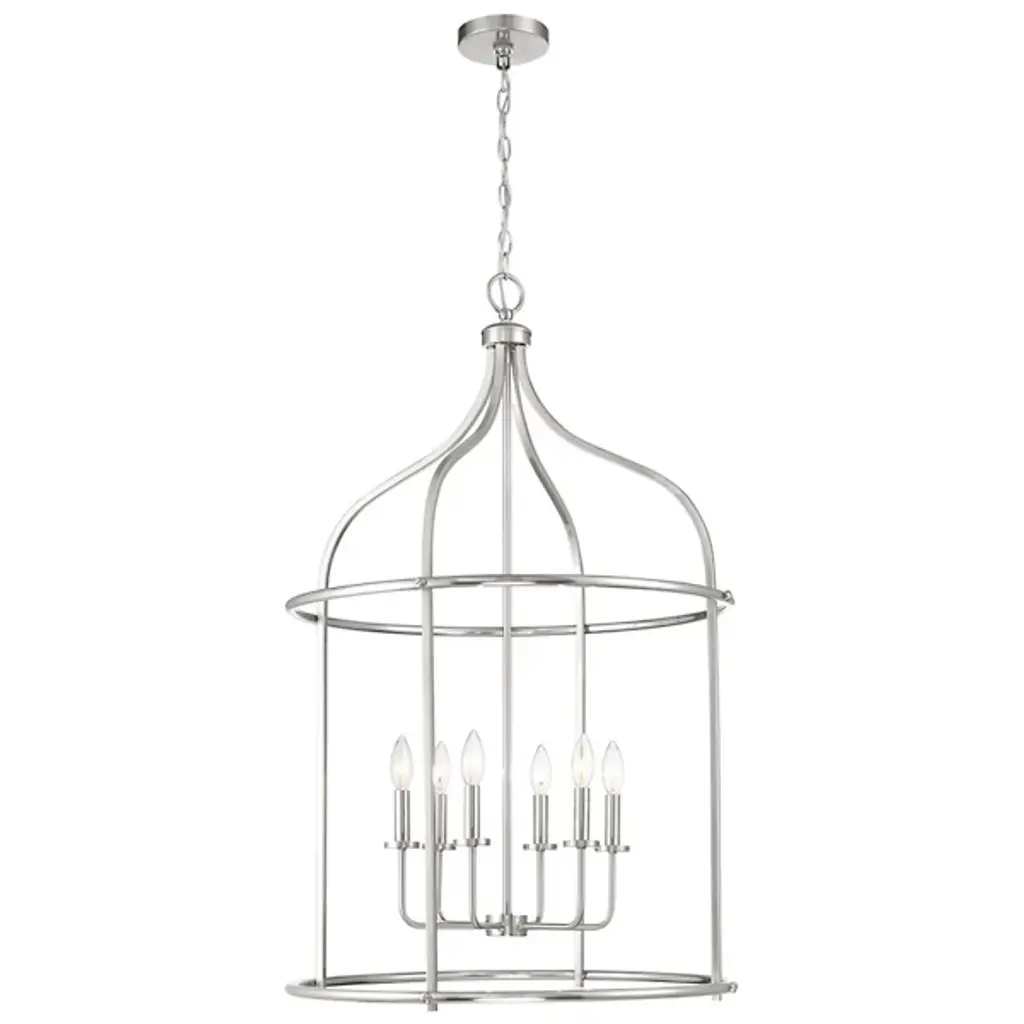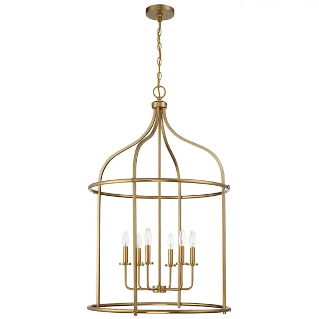 The Brookstone Pendant from Savoy House is a striking example of transitional style. It features an elegant, simple open cage lantern-style design with a warm brass finish. This fixture is made from durable metal, ensuring both style and longevity. The open lamping is perfect for illuminating large spaces like entryways. Its understated elegance and substantial size make it a bold yet refined choice, blending traditional and contemporary elements with ease.