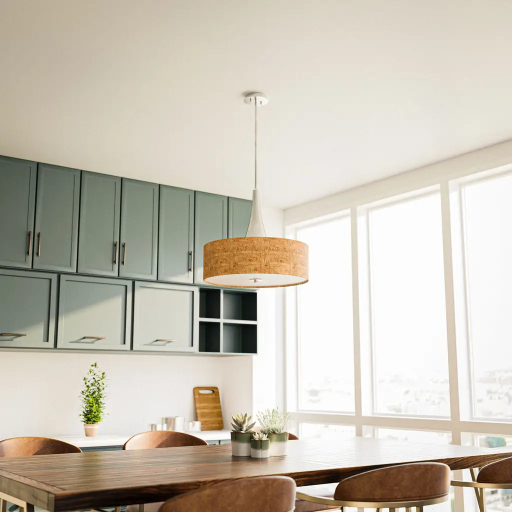 With a sleek brushed-steel trumpet base over a warm, natural-cork drum shade, our three-light pendant lamp is a fashionable update for any decor style. Featuring a diffuser to soften harsh glare and extension poles for an adjustable height, this versatile accent is perfect hanging over a dining table or in the kitchen.