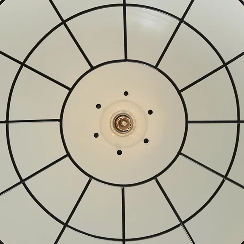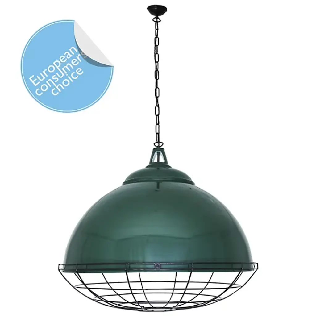 The Brussels Pendant from Mullan Lighting uses a grid-shaped cage to show off industrial style meeting straightforward design. It’s made in Ireland and places a strong lamp inside a dome-shaped metal shade with a smooth outside and pale interior. The light within shines out below, accompanied by reflected glow from the sleek sides, while the cage adds a slender pattern of shadows amid the even downlight. Ideal for high ceilings, whether residential or commercial, the large lamp hovers on a slender chain, spreading a focused ambiance below.