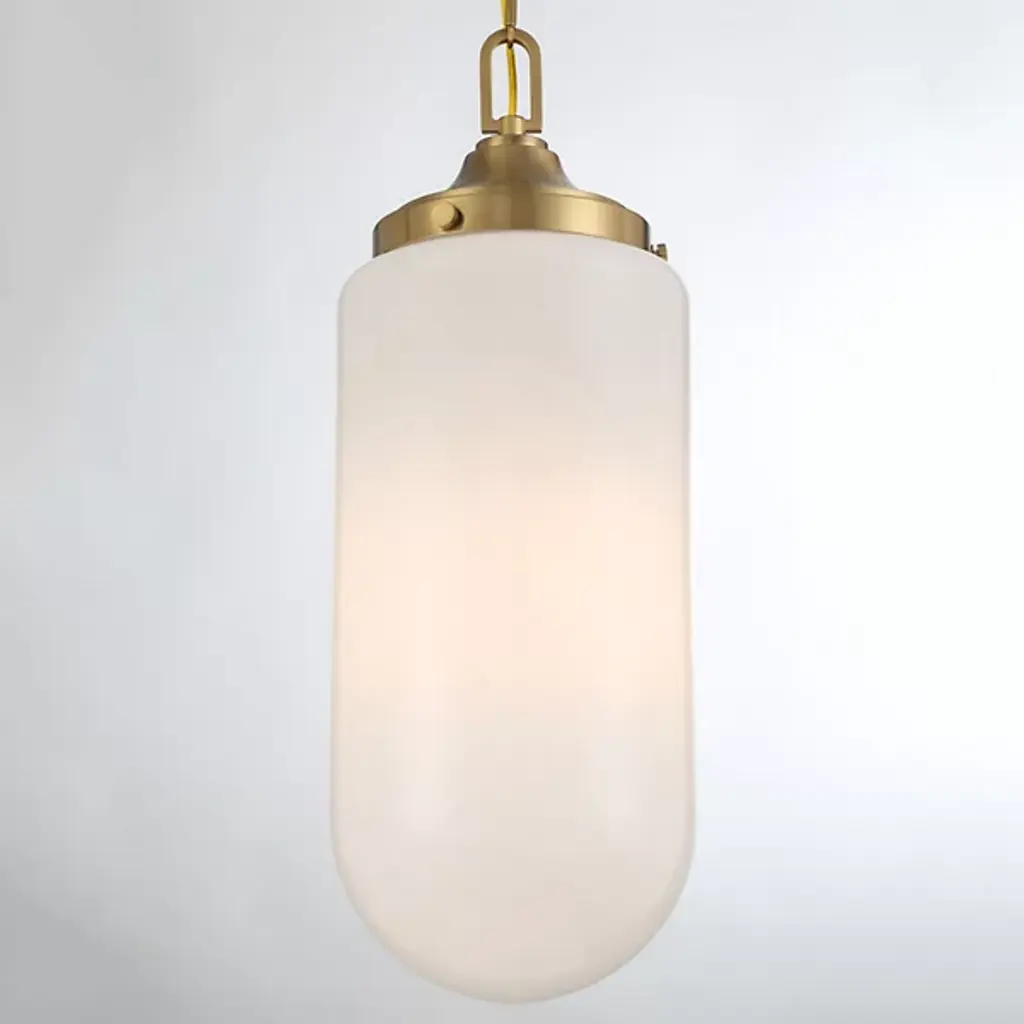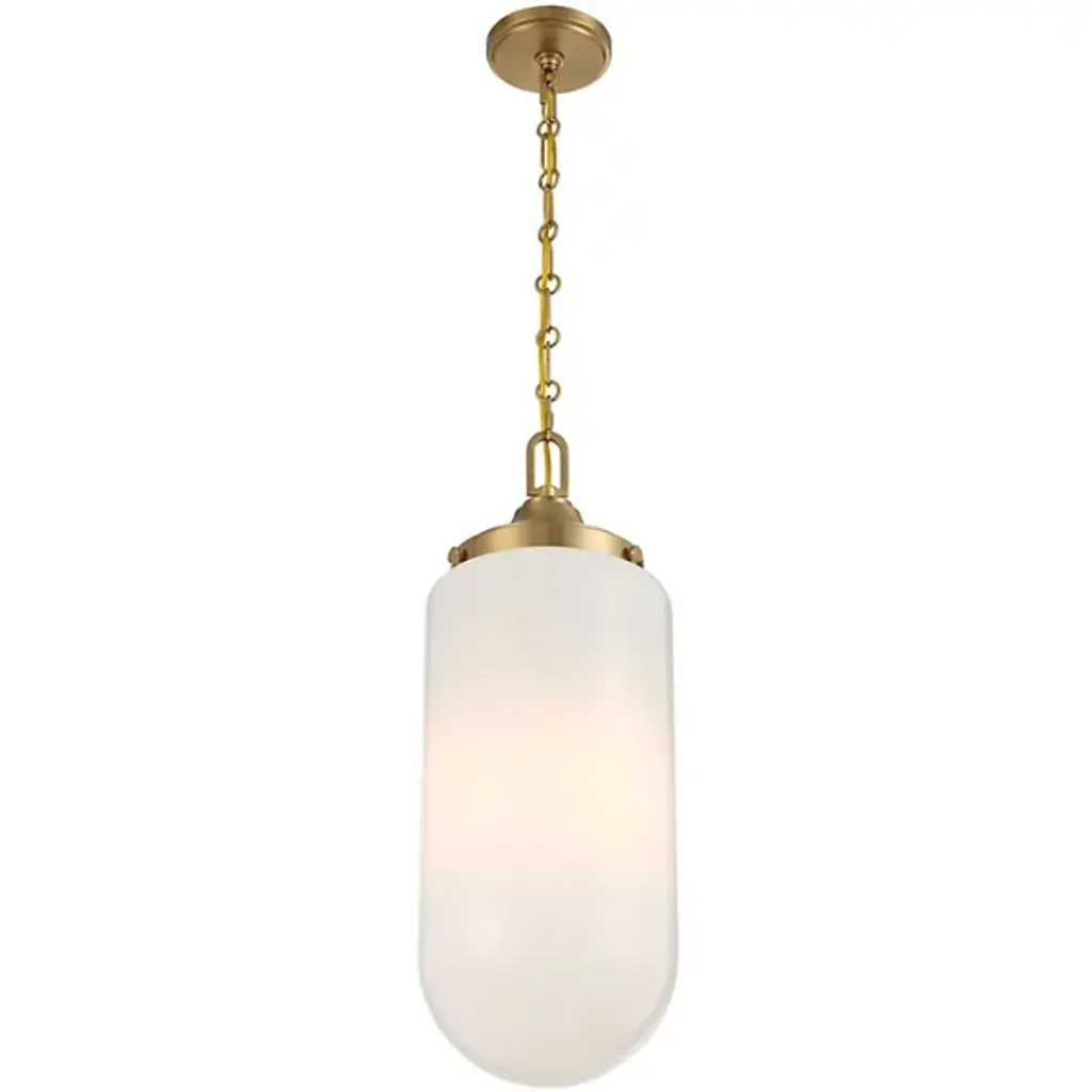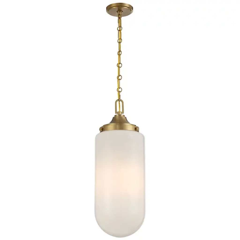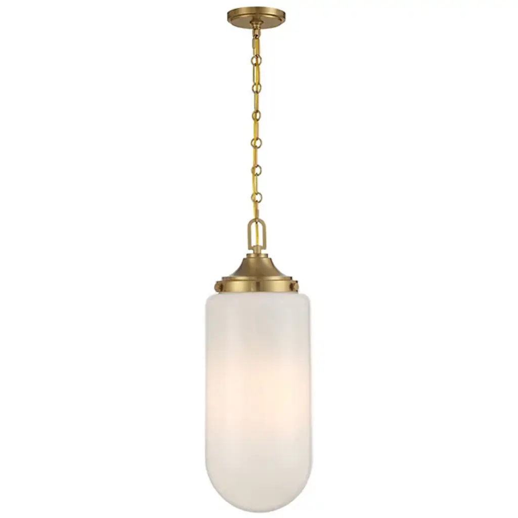 The Bryant Pendant from Savoy House offers a soft vintage character to indoor ceilings. A transitional style fixture with a chain-suspended understated structure, it lets the beautiful strie glass dome shade take center stage. This versatile piece, finished in Warm Brass, contrasts nicely with the gorgeous glass to create a striking visual impact. The pendant blends traditional and contemporary design elements, transmitting an even ambiance around the fixture.