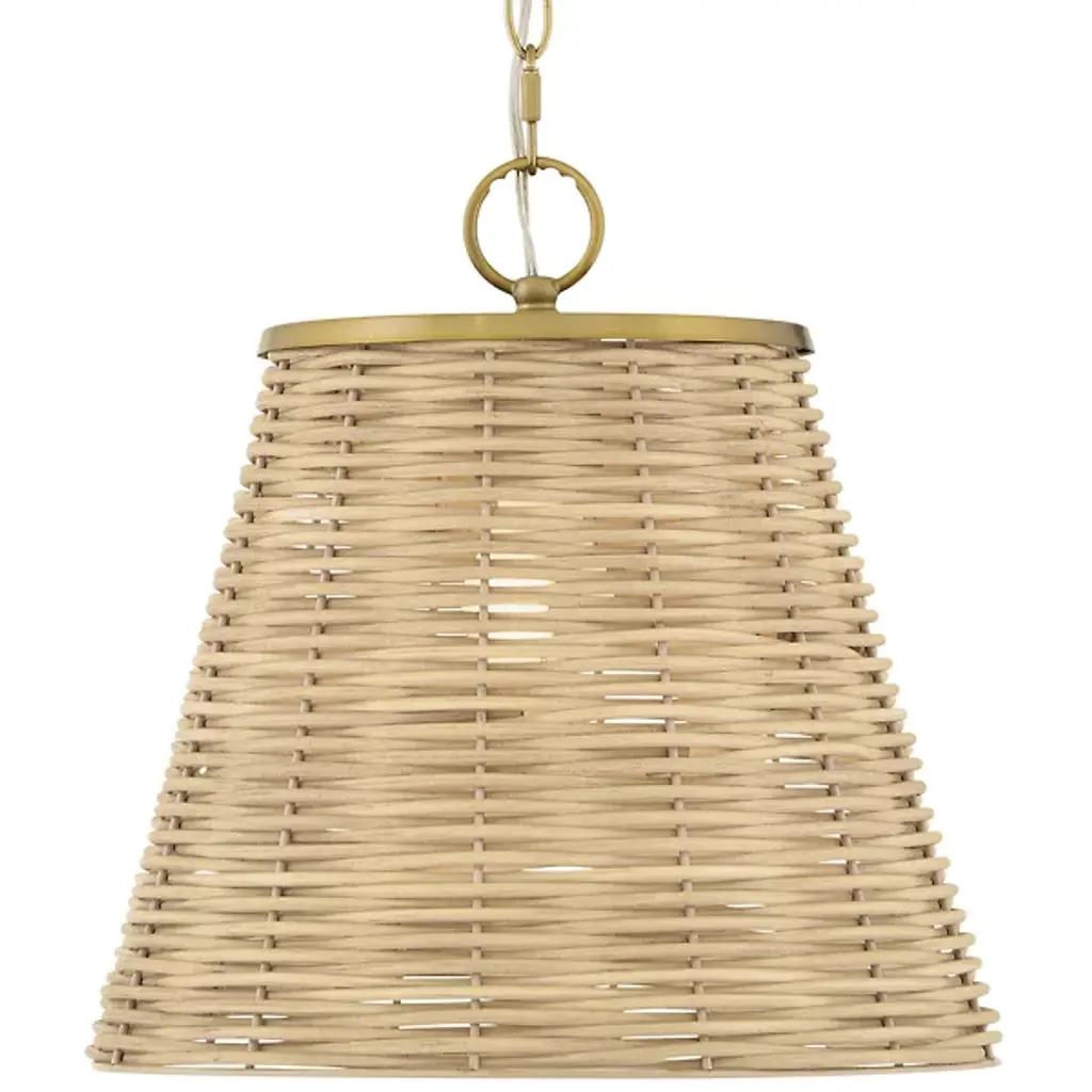 The Brynn Pendant from Lark captures timeless style with a classic cool profile. It features a woven rattan shade that seamlessly blends bohemian and coastal vibes. This unique combination adds a touch of natural elegance to any space, creating a warm and inviting atmosphere. Perfect for both traditional and contemporary settings, this product's design effortlessly enhances your décor with its rustic charm and versatile appeal. This makes it ideal for bringing a relaxed yet sophisticated ambiance to your home.