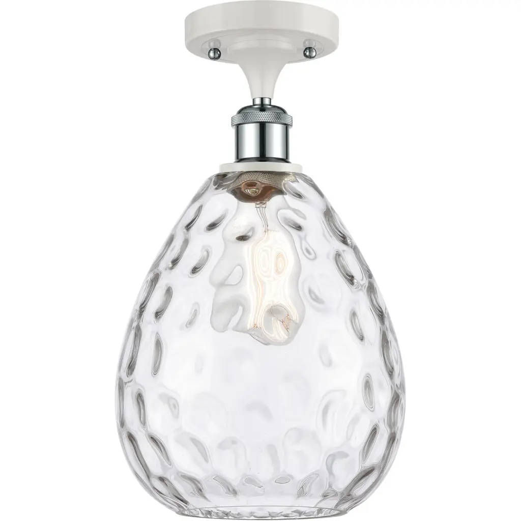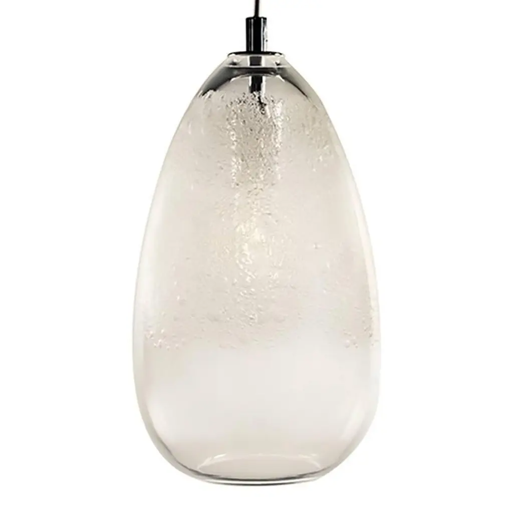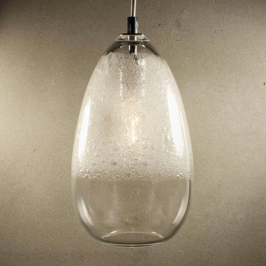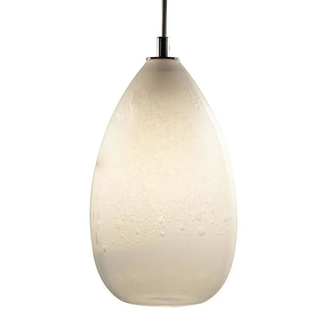 These works continue the language of contrast of the lattimo and banded lines, but use a swath of textured whipped glass. This is then paired with a selection of soft colors and simple forms. The bubbles cloud and diffuse the bulb and add elements of patterning on nearby surfaces. SPECSDimensions: 7.0” Ø, 12.0” HMaterials: glass, metalProduct weight: 6.0 lbsLight source: medium base E26 socketLamping: E26 base, G25 lamp, 40 W max250 V AC MaxRound canopy with cloth covered SJT-3 CableCanopy dimensions: 5” Ø, 0.3”Field adjustable drop length: 0’6” min - 6’0” maxCanopy finish matches Metal Finish.”Suitable for sloped ceilingsUL listed for damp locationsC-UL-US