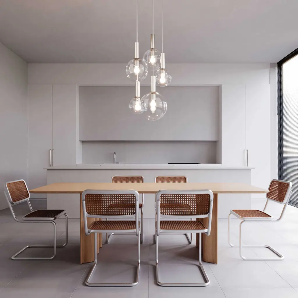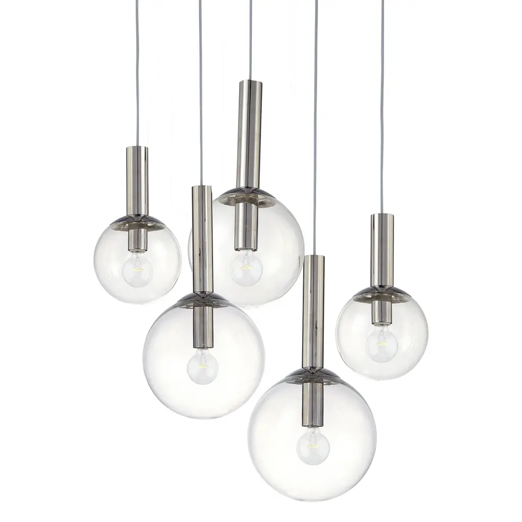 Bubbles 5-Light Pendant, a playful, casually yet classic icon of mid-century modern lighting design is of infinite variety and proportions. Its straightforward clarity echoes the modern pathos of form from function as its aesthetic basis. Featuring shades in multiple sizes and polished nickel metal support. Features