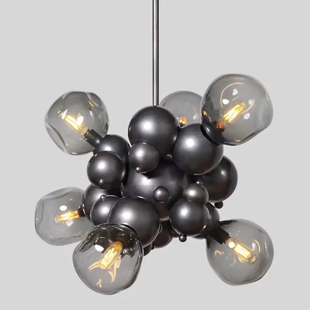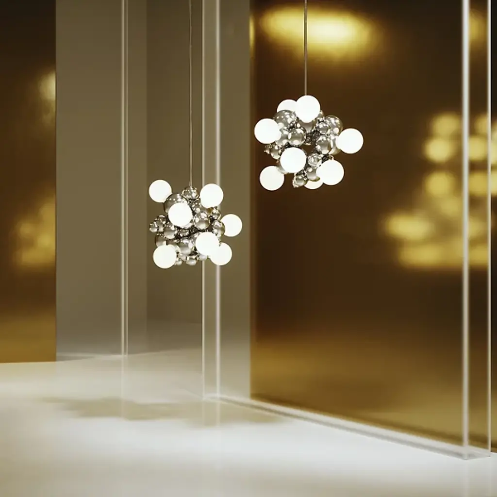 Tone-setting like a popped bottle of bubbly, the Bubbly 06 Pendant from Rosie Li Studio excites while off or on in a clustered design inspired by soap bubbles and the botryoidal hematite mineral. Ditching traditional design cues, Rosie Li Studio creates science, math, and nature-infused pieces out of pared-down forms. The globe shape unites this piece, starting with a clustered brass body that visually appears ready to burst. The different sizes of the globes seduce with a sense of depth. Bright lamping pairs with handblown glass all around to create a warmth-filled atmosphere. The light accentuates the piece’s light-hearted silhouette.
