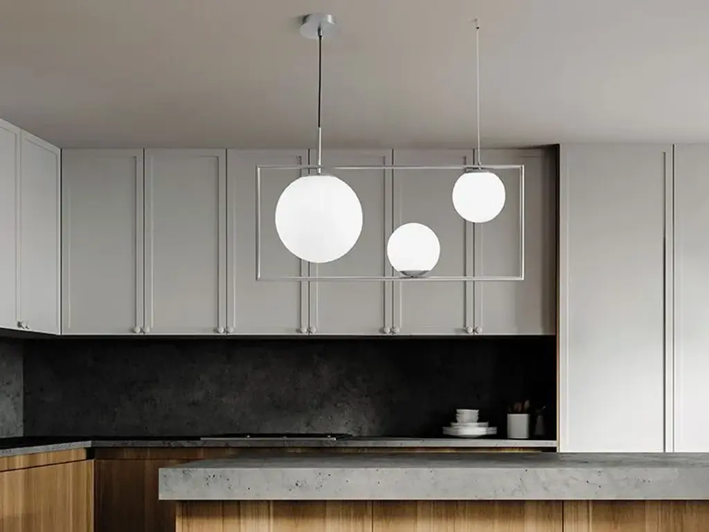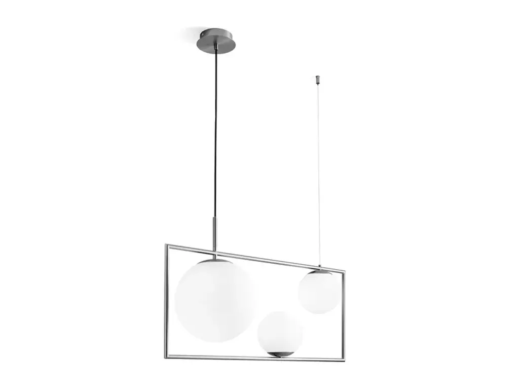 BUBLE is a suspension lamp with metal tube frame with a brushed gold finish. Opal glass diffusers. Brushed gold ceiling cover. Black 200 cm power supply cord. Compatible with 3 x E27 LED light bulbs. Source E27 LED | Power 3 x max 20wA frame with a view onto our dynamic lifestyles. Toughness and liveliness coexist, with the stiff and squared frame containing and supporting BUBLE, a series of opal glass bubbles, in multiple sizes and positions. The asymmetric lights articulate the space, with their proportions giving it balance, and the assembly making BUBLE fascinating and timeless.