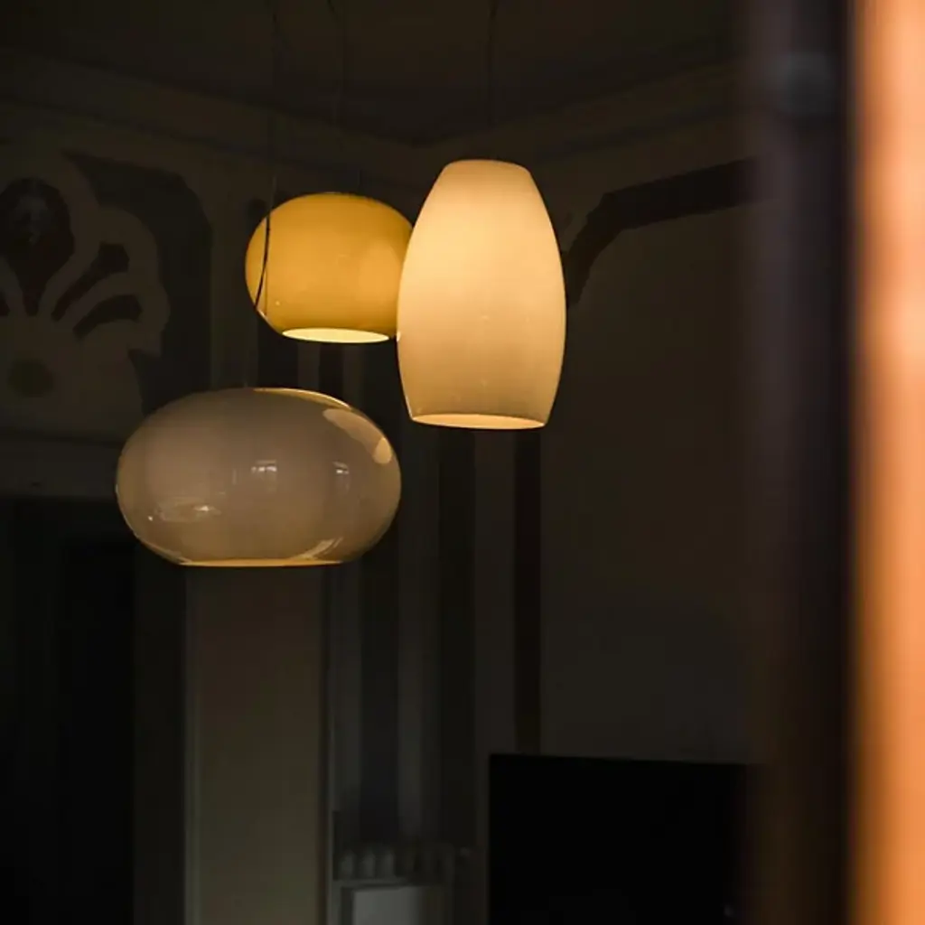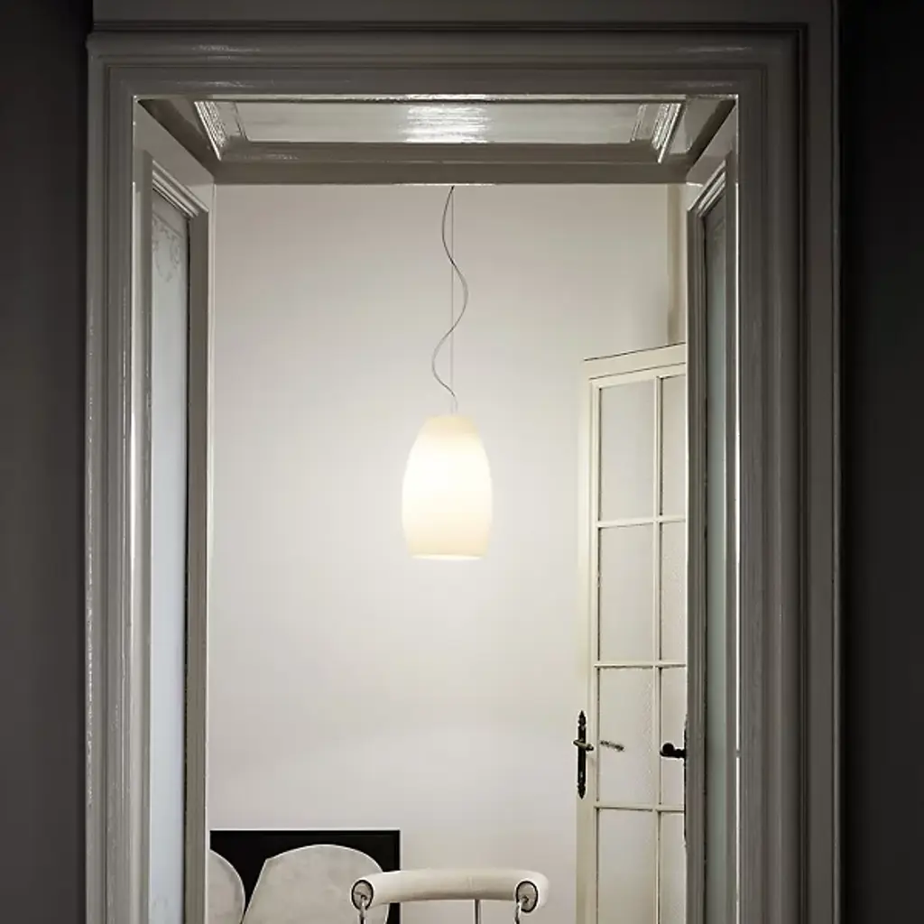 Contemporary aesthetic radiates from the Buds 1 Pendant by Foscarini. This stylish pendant light is furnished with a curved Hand Blown Glass shade and features a glossy, sleek finish. When illuminated, a downward light is projected from the fixture, thus making it ideal for placement overlooking dining room tables, entryways, or open living spaces.