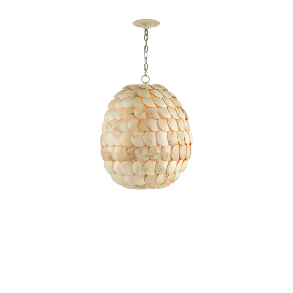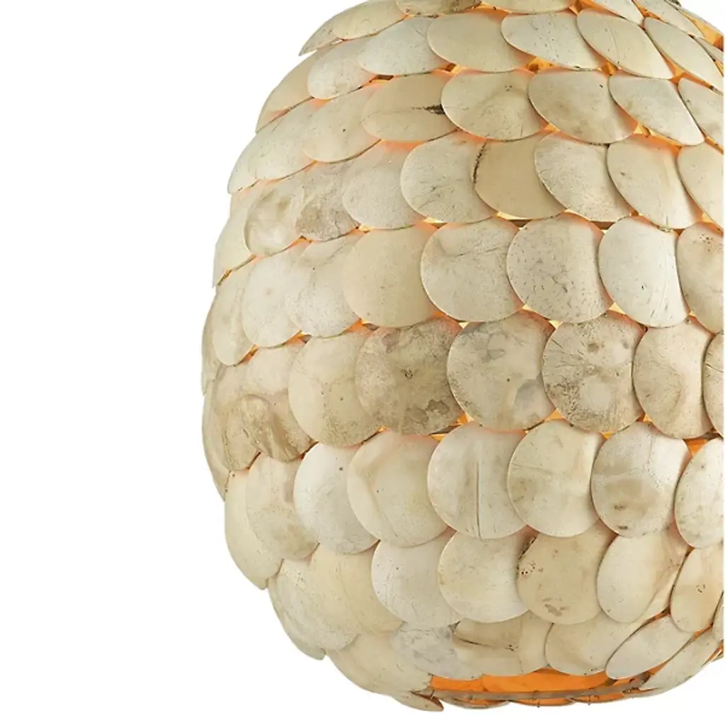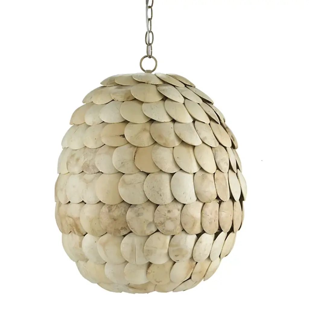 Clean, charming, creamy. Mellow out your room with the coconut shell-filtered light of the Buko Pendant from Currey & Company. This piece brings tropical vibes to you. It makes an elegant entrance with a chain-link suspension. Artisans compose an iron frame in stages to bring to life a curvy form. Along the frame, disc-shaped coconut shells overlap each other one by one like an otherworldly fruit. While bleached for a creamy look, the coconut shells' natural dark texture comes through on its surface as a painterly element. The tight crevices between the shells and the bottom opening serve as passages for a golden glow. The warm, filtered light introduces a relaxing ambiance to the room.