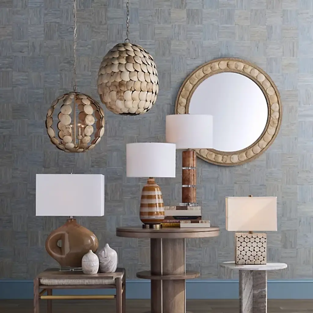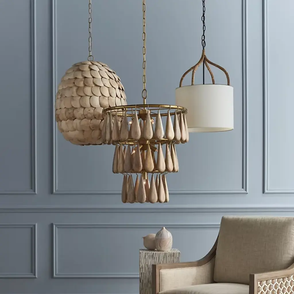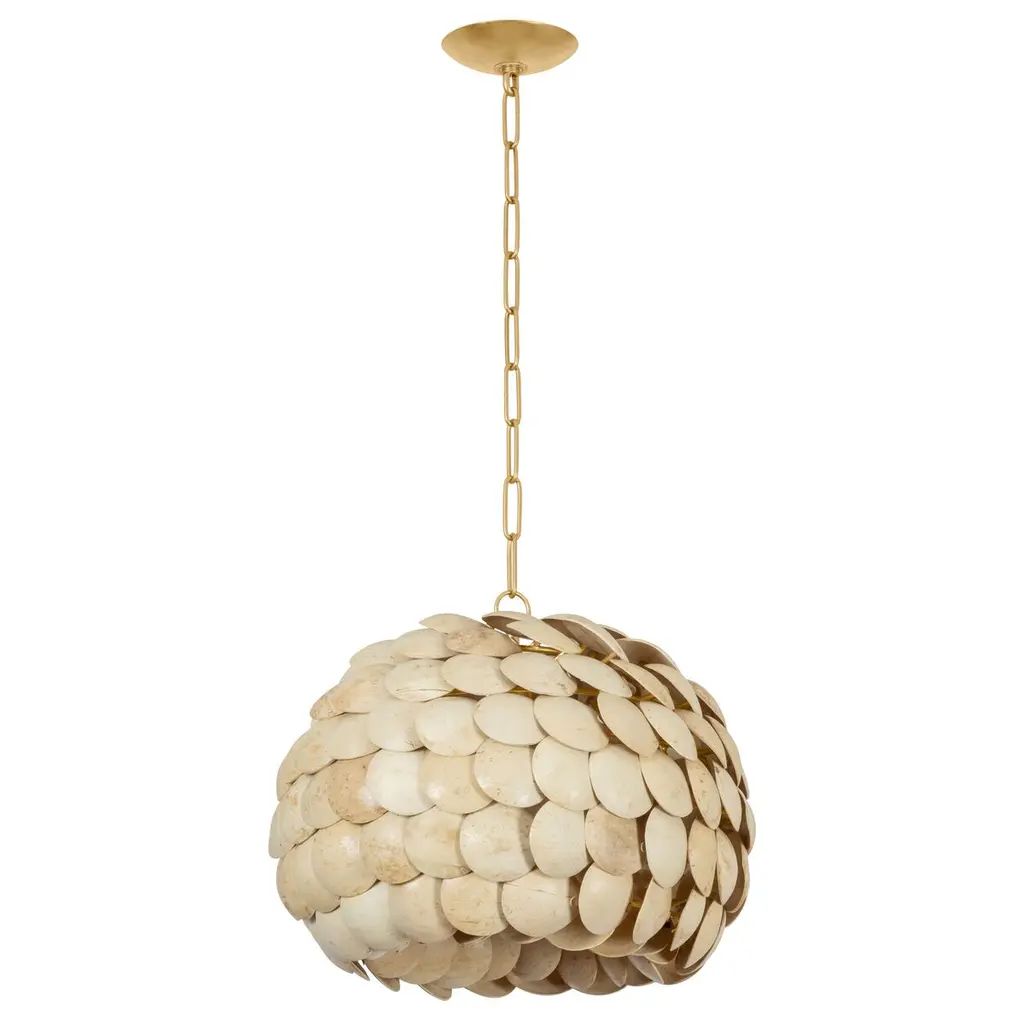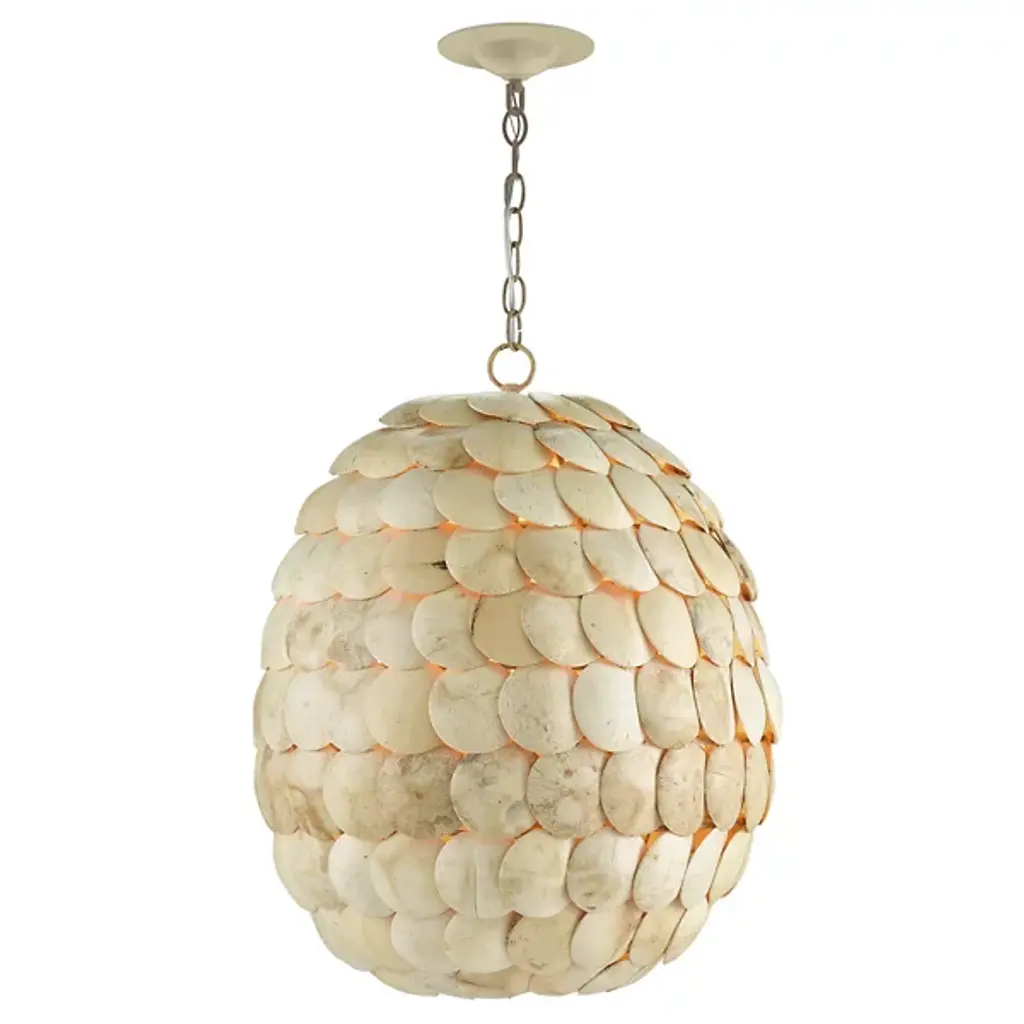 Clean, charming, creamy. Mellow out your room with the coconut shell-filtered light of the Buko Pendant from Currey & Company. This piece brings tropical vibes to you. It makes an elegant entrance with a chain-link suspension. Artisans compose an iron frame in stages to bring to life a curvy form. Along the frame, disc-shaped coconut shells overlap each other one by one like an otherworldly fruit. While bleached for a creamy look, the coconut shells' natural dark texture comes through on its surface as a painterly element. The tight crevices between the shells and the bottom opening serve as passages for a golden glow. The warm, filtered light introduces a relaxing ambiance to the room.