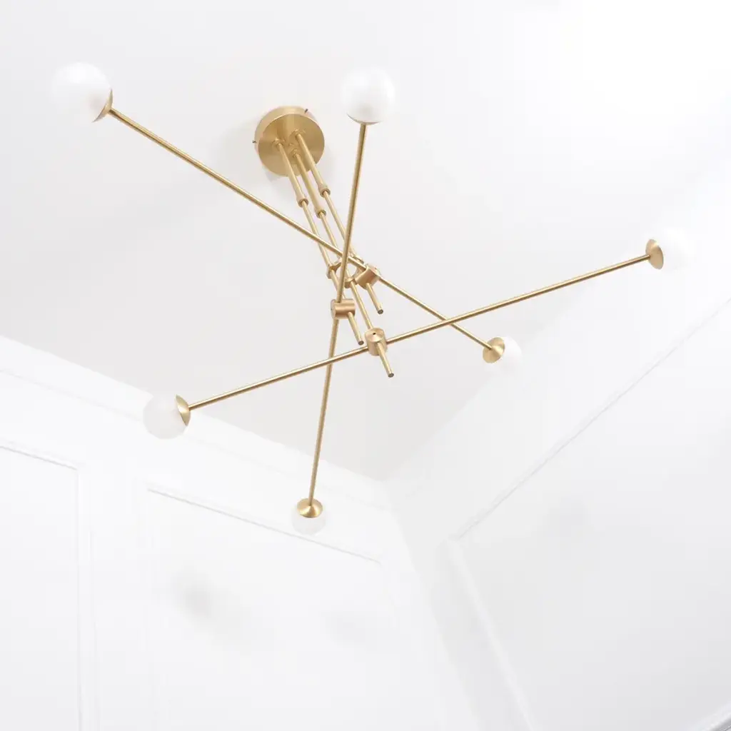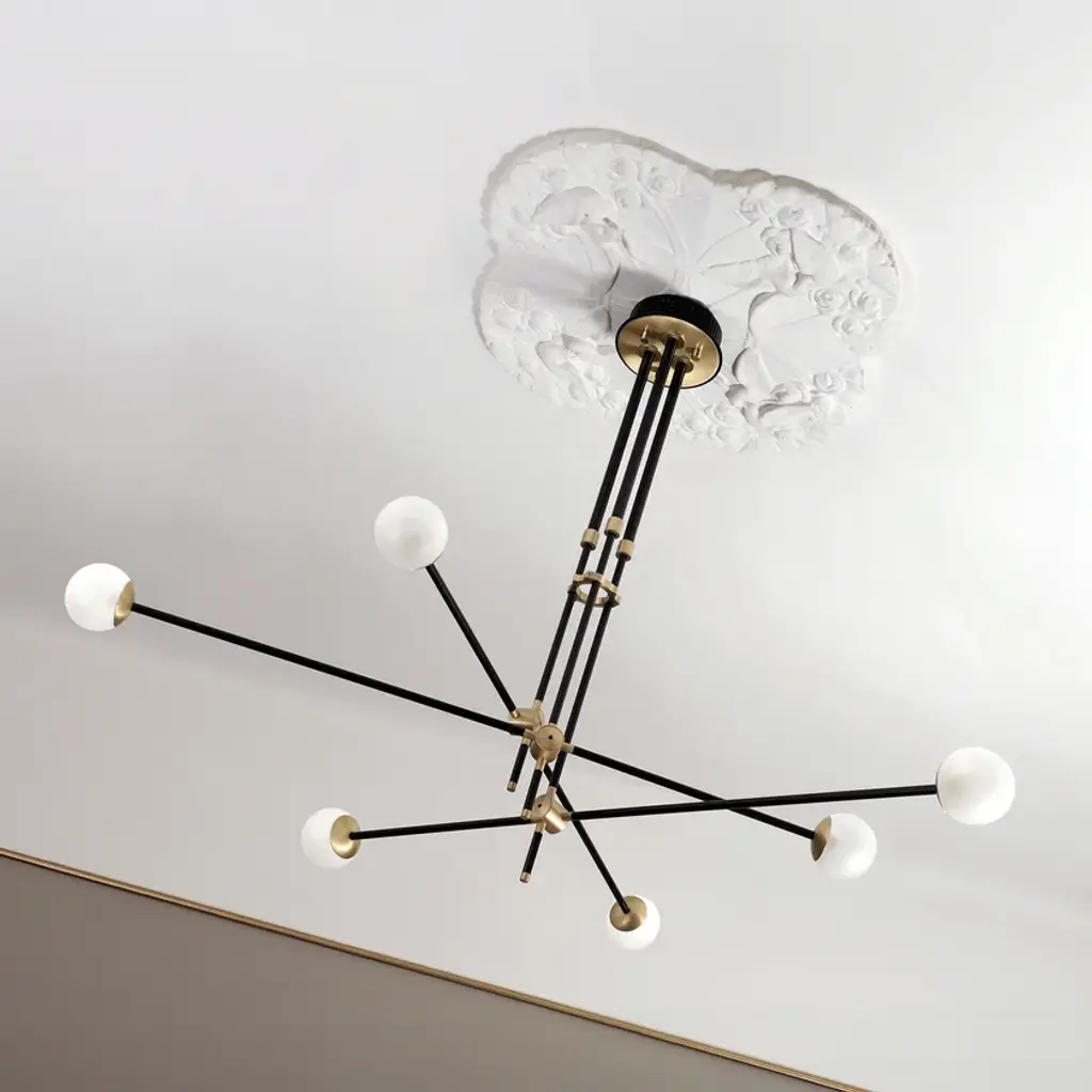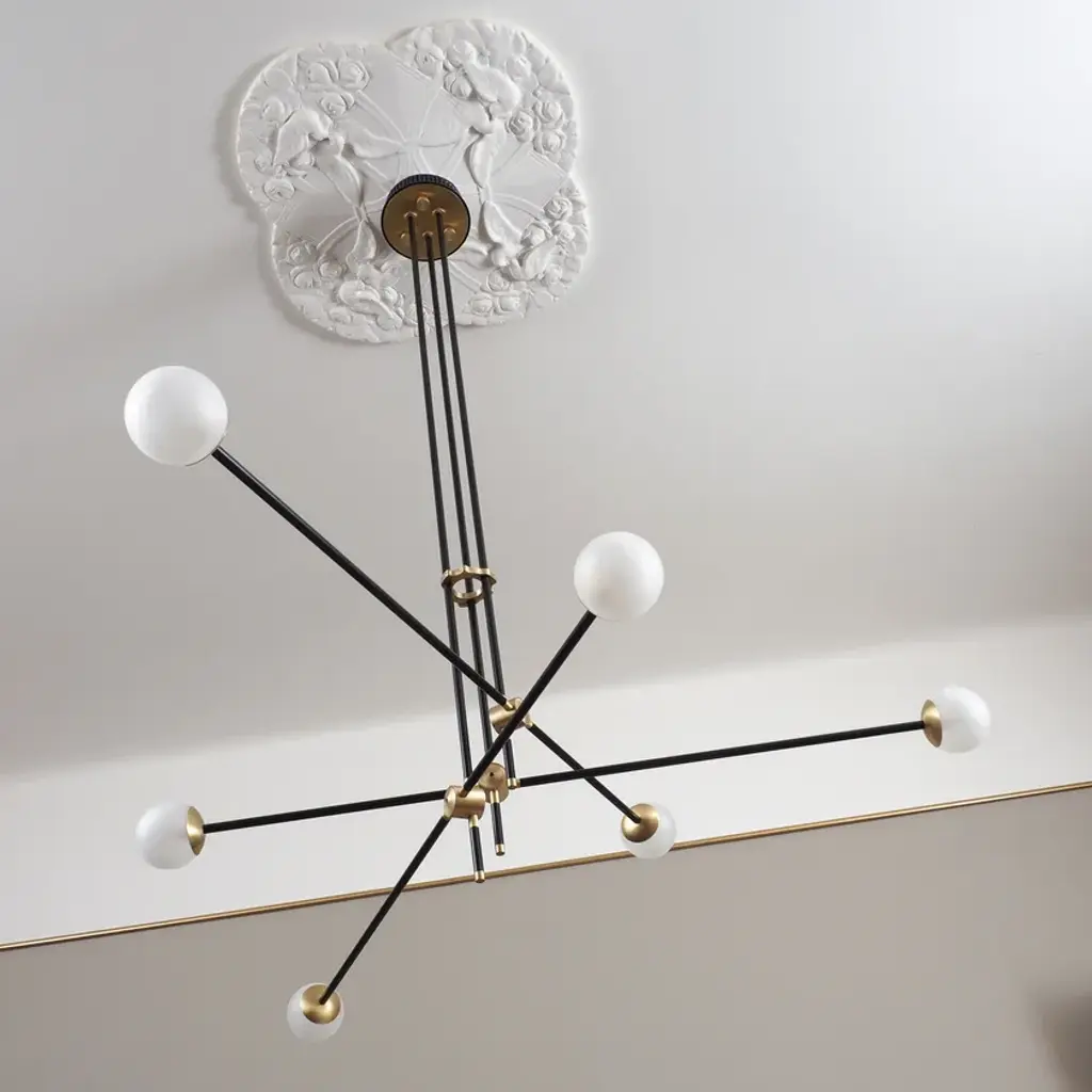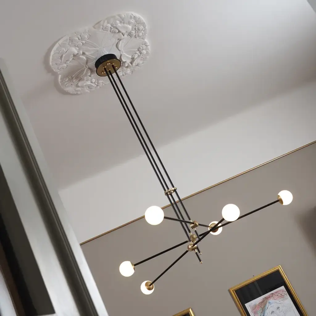 BULLARUM SI-6 is a suspension lamp with brass or copper body and blown glass spheres.HALOGEN ILLUMINATION: (120V / 240V)Socket : G6,35Bulb : 6 x 35 Watts halogenWattage : 210 WattsLumens : 2400 LumensColor temperature : 2900KEnergy classes : CDimmable : yesLED ILLUMINATION: (120V / 240V)Socket : G4Bulb : 6 x 3,5 Watts LEDWattage : 21 WattsLumens : 1800 LumensColor temperature : 2700-3000KEnergy classes : A+ LEDDimmable : yesTRASFORMERS TYPE:Lightech let 75 12v /230-240v (eu)Lightech let 75 12v /110-120v (us)Toroid-Matic 30w /90-264v (led)MATERIALS:Brass or copper body, hand - blowen glassFINISHES:Brass - polished, brashed, antiqueCopper - polished, brashedCromeBlack or white (powder coated)Order options the all finishes, and RAL colorsCERTIFICATION:CE certification of european conformityUL approved componentsSimple, elegant forms and shapes, the finest quality of materials and workmanship. This is how best to describe Intueri’s Bullarum Collection.Since 2012 we are constantly improving this lighting family to offer the highest quality. From the perfectly finished rodes to the last screw all the products are designed, produced and assembled by Intueri LightEvery lamp is equipped with a telescopic rod, to adjust it to the perfect height for the fixture.There are 9 unique main finishes and another 9 detail finishes available for every lamp in this collection, so it customizable for the mood of the room where the fixture is going to be mounted.We believe in fast and compact shipping solutions. The lightings are arriving in a compact wooden box which secured not to be damaged through the shipping process. These boxes are compatible with air transport, even in 2 days after production the lamps can arrive anywhere in the globe.At the design table we decided that the lighting has to be easy to assemble, it takes a few minutes after putting it out from the box to mount the fixture.After mounting it, all the joints could be adjusted to accomplish the perfect visual effect.