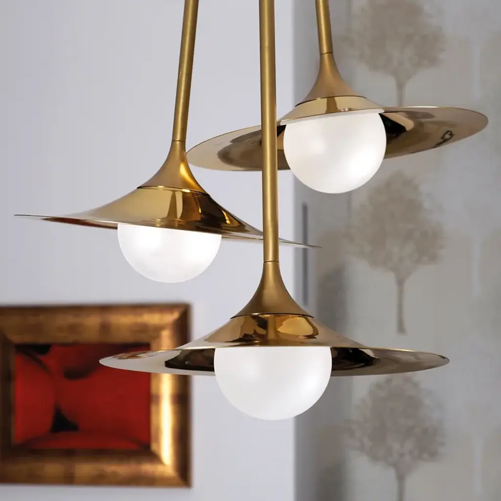 BULLARUM SS-3 DISC is a suspension lamp with brass or copper body and blown glass spheres.HALOGEN ILLUMINATION: (120V / 240V)Halogen lightbulbs are not included to the fixture, but it is capable of accepting high voltage, G4, G5.3 and G6.35 halogen bulbs up to 35W.LED ILLUMINATION: (120V / 240V)Socket : G4Bulb : 3 x 5 Watts LEDWattage : 15 WattsLumens : 1200 LumensColor temperature : 2700-3000KEnergy classes : A+ LEDDimmable : yesMATERIALS:Brass or copper body, hand - blowen glassFINISHES:Brass - polished, brashed, antiqueCopper - polished, brashedCromeBlack or white (powder coated)Order options the all finishes, and RAL colorsCERTIFICATION:CE certification of european conformityUL approved componentsIP 20 or IP 44Simple, elegant forms and shapes, the finest quality of materials and workmanship. This is how best to describe Intueri’s Bullarum Collection.Since 2012 we are constantly improving this lighting family to offer the highest quality. From the perfectly finished rodes to the last screw all the products are designed, produced and assembled by Intueri LightEvery lamp is equipped with a telescopic rod, to adjust it to the perfect height for the fixture.There are 9 unique main finishes and another 9 detail finishes available for every lamp in this collection, so it customizable for the mood of the room where the fixture is going to be mounted.We believe in fast and compact shipping solutions. The lightings are arriving in a compact wooden box which secured not to be damaged through the shipping process. These boxes are compatible with air transport, even in 2 days after production the lamps can arrive anywhere in the globe.At the design table we decided that the lighting has to be easy to assemble, it takes a few minutes after putting it out from the box to mount the fixture.After mounting it, all the joints could be adjusted to accomplish the perfect visual effect.