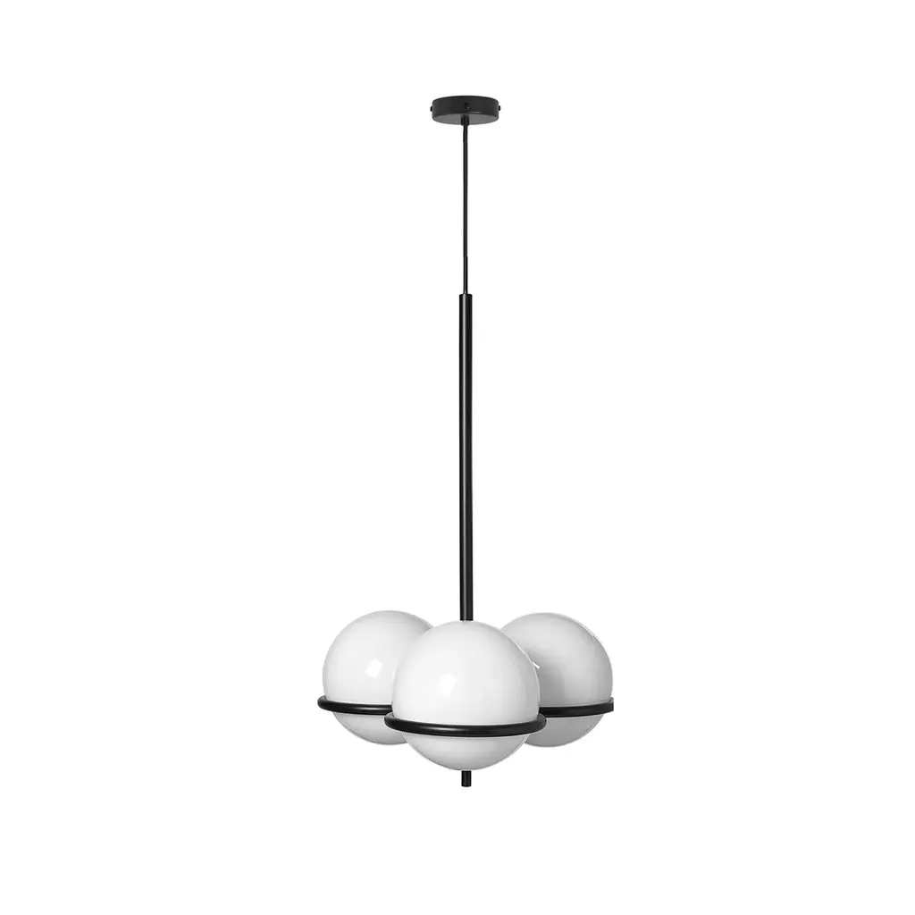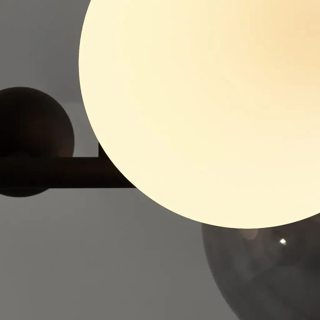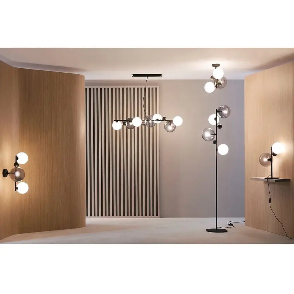 A play of light spheres in balance, poetry and emotion for the Bullesco chandelier that makes smoked glass, opaline and metal dance.Glass and steel with gunmetal epoxy finish + 3 smoked blown glass globes Ø18 cm4 white color opaline globes with matte finish Ø14 cm3 steel spheres Ø6 cmSteel cables adjustable in height and electric cable covered in black fabric7 GU9 lamp holders for 3W bulbs (not supplied)