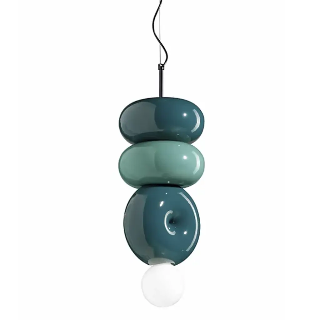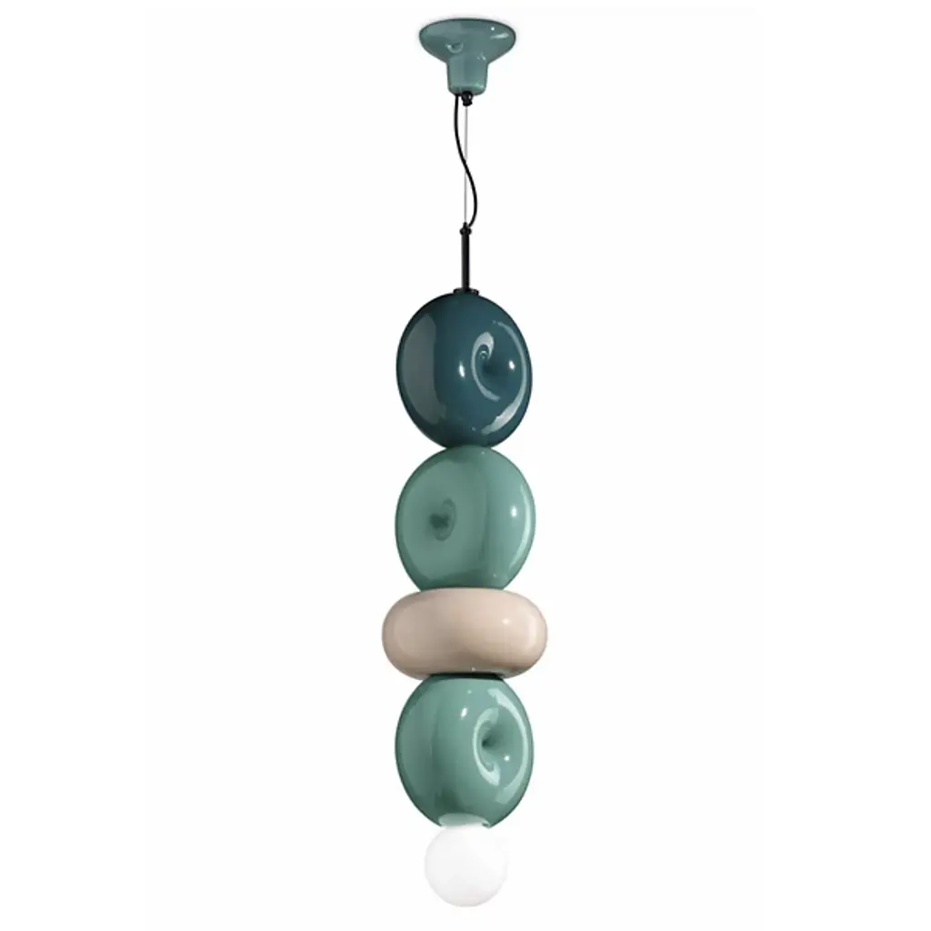 The Bumbum Tall Stacked Pendant from Ferroluce enchants with a comforting arrangement of soft surfaces and interlocking swirls. Suspended from a ceramic canopy via a slim cable, it stacks ceramic accents and glass below, creating an array of complementary colors and delivering ample ambiance blow enhanced by gleaming reflections. The charming name provokes a smile, creating a reassuring, retro presence that transforms its surroundings, adding a well-rounded charm to high ceilings.