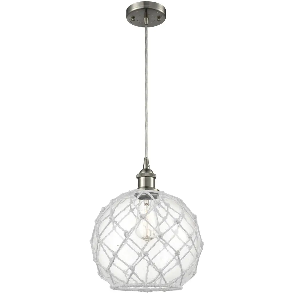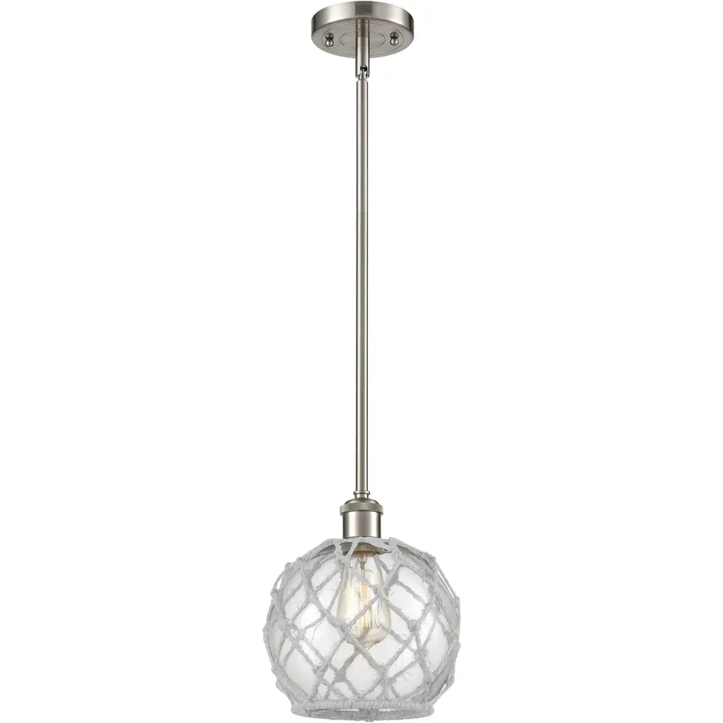 If you have that lovely beach house, condo, or rental you're looking to decorate, check out this nautical hanging pendant suited for your coastal decor! The aqua glass 12" ball is netted in a natural rope hanging from a clear cord that can be adjusted to the desired height of your ceiling. This pendant's brushed nickel canopy offers a sleek bit of detail that is perfectly complimentary to the overall lighting style. Hang this pendant in your bedroom, living room, foyer, bar area or even dining room!