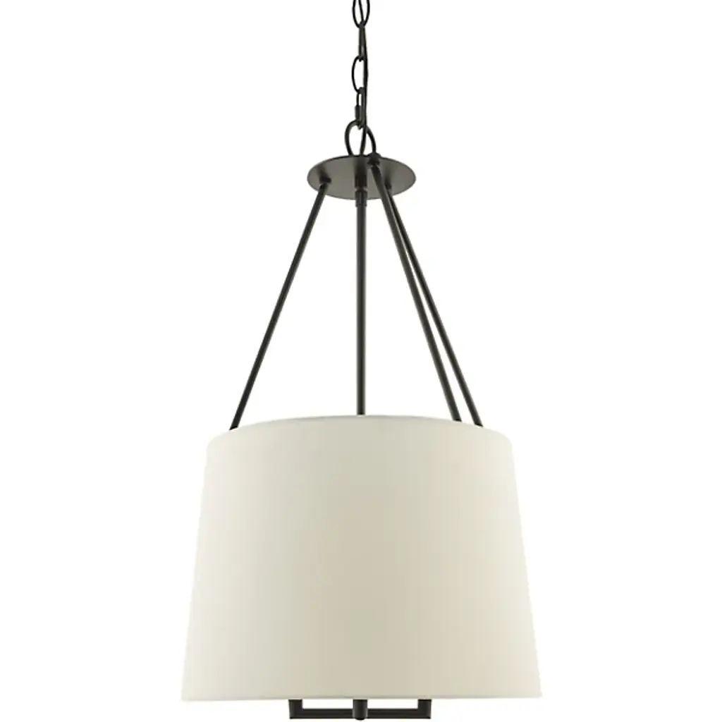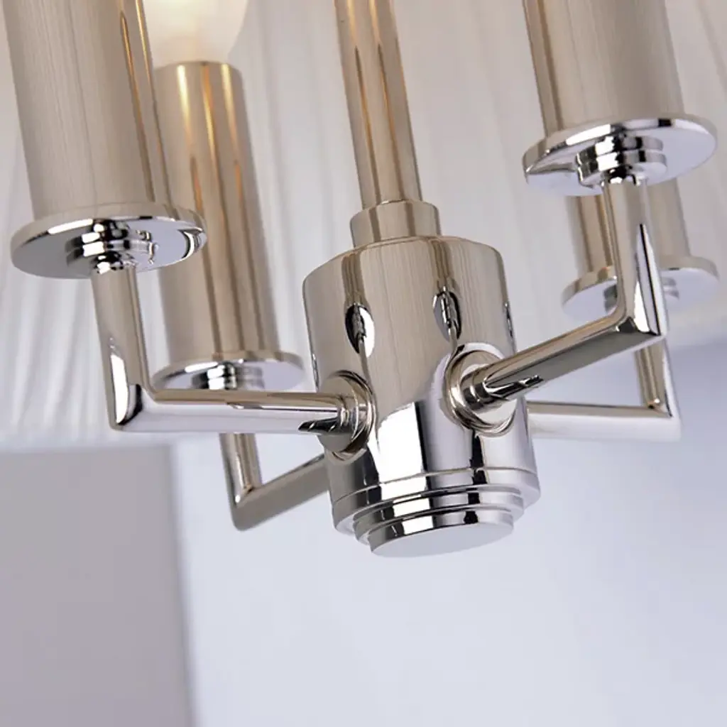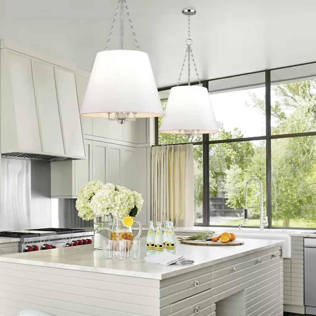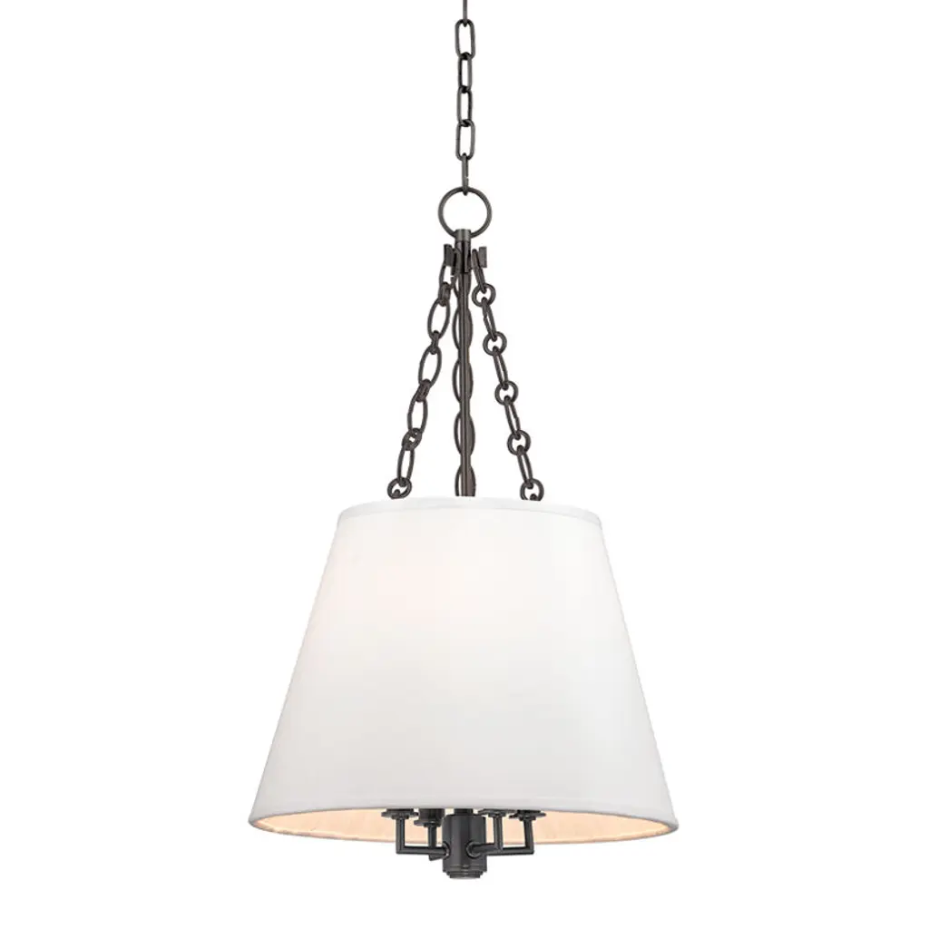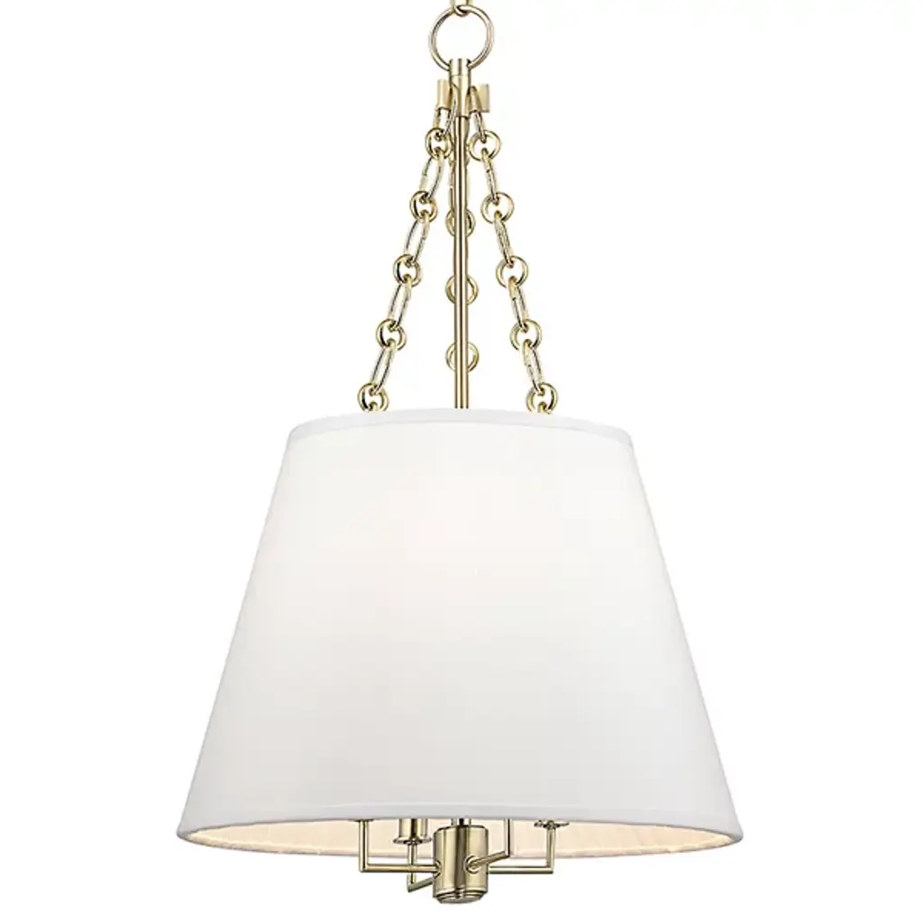 At once smooth and sumptuous, the Hudson Valley Burdett Pendant impresses with a minimalist silhouette that gives way to extravagant details. The flared White Faux Silk shade is classically clean, concealing an opulent interior with rich gathered pleating. Three decorative chain lengths secure the fixture to its center stem, which in turn connects to the suspension chain. A modern allusion to Victorian aesthetics, without the fuss.