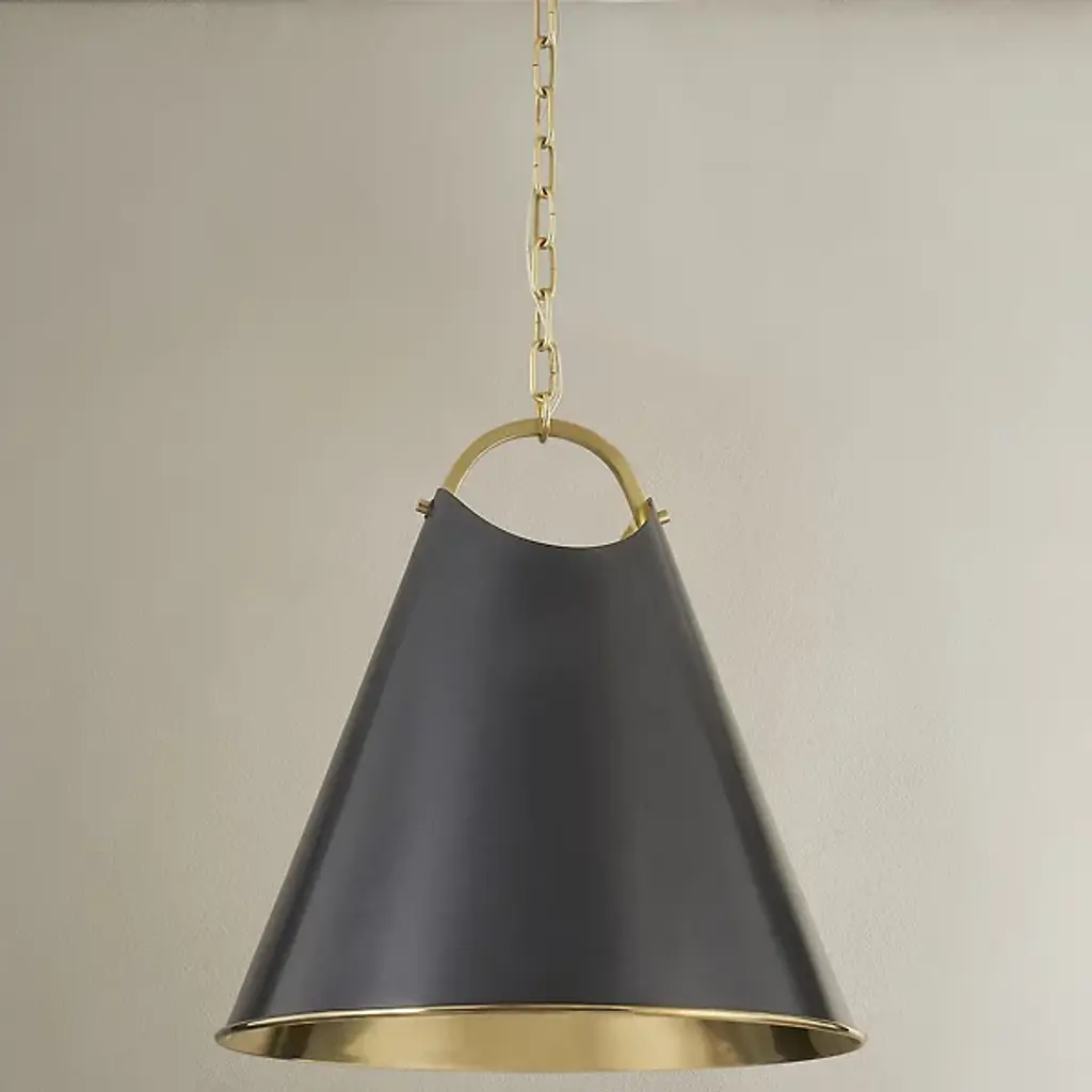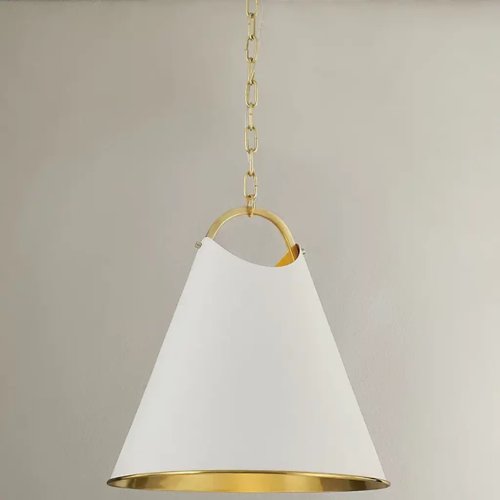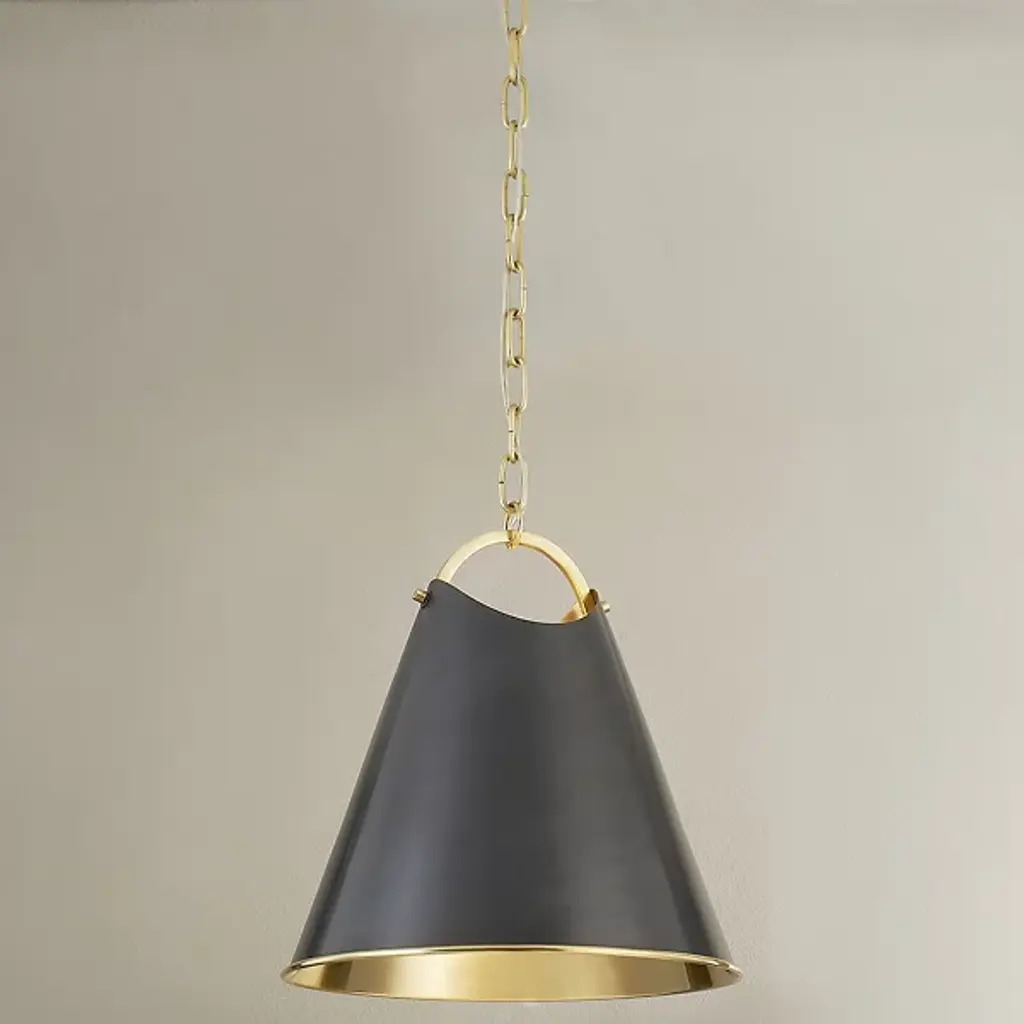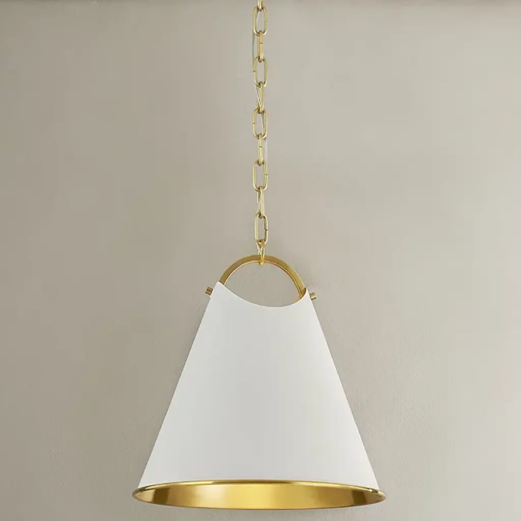 The Burnbay Pendant from Hudson Valley Lighting features a conical shade in Aged Old Bronze or Soft White and is accented by a contrasting Aged Brass interior and rolled edge detail for an unexpected take on tradition. It is paired with an AGB arched strap and jewelry-like chain, and these stylish pendants evoke a designer handbag quality that will add a fashionable element to a kitchen island, bedroom, or foyer.