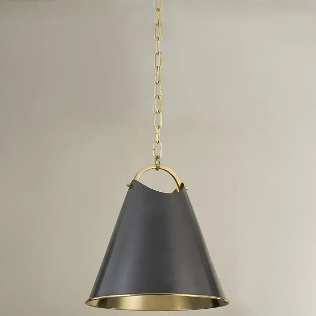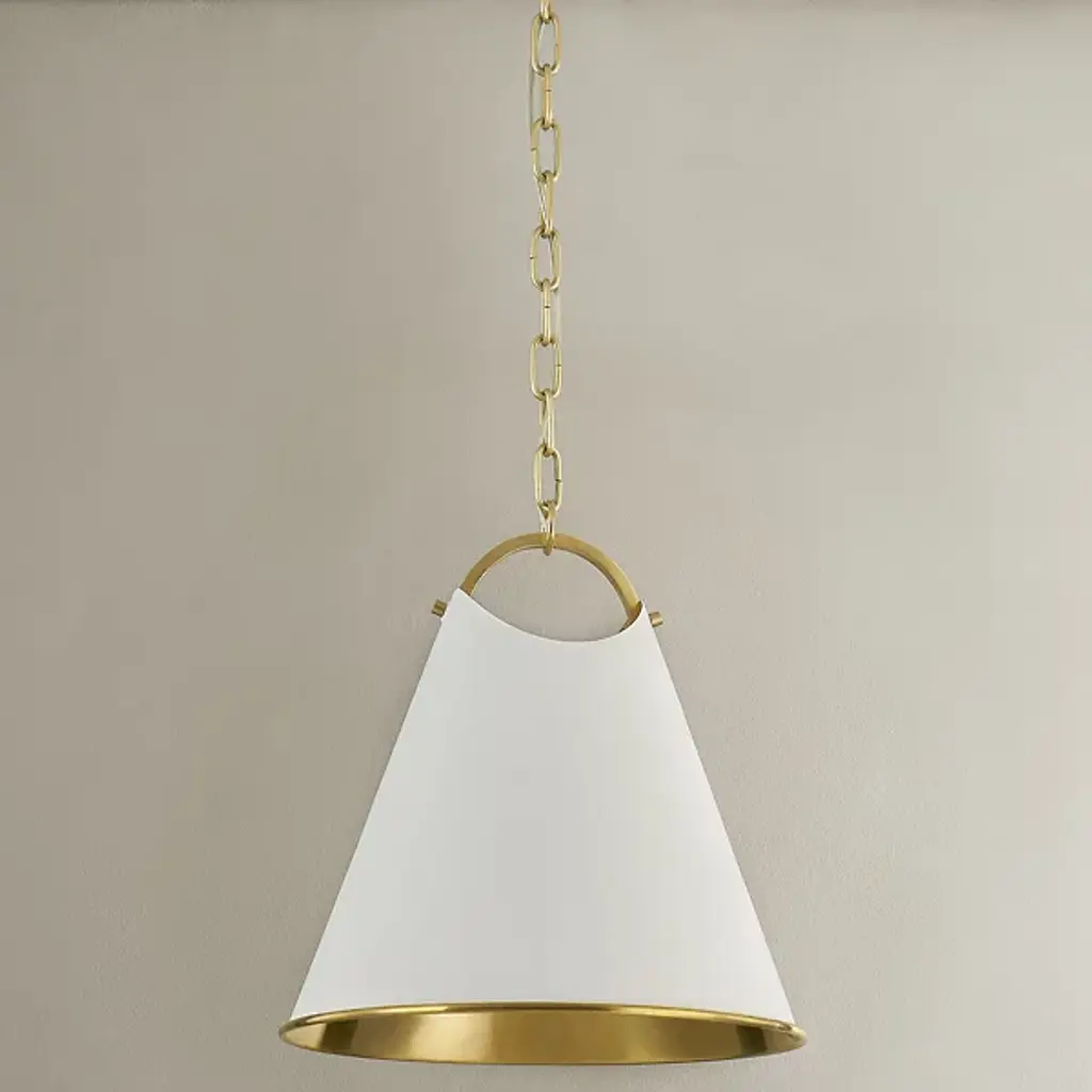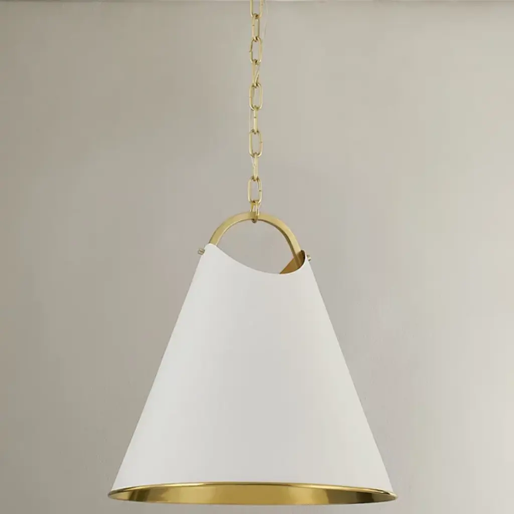 The Burnbay Pendant from Hudson Valley Lighting features a conical shade in Aged Old Bronze or Soft White and is accented by a contrasting Aged Brass interior and rolled edge detail for an unexpected take on tradition. It is paired with an AGB arched strap and jewelry-like chain, and these stylish pendants evoke a designer handbag quality that will add a fashionable element to a kitchen island, bedroom, or foyer.