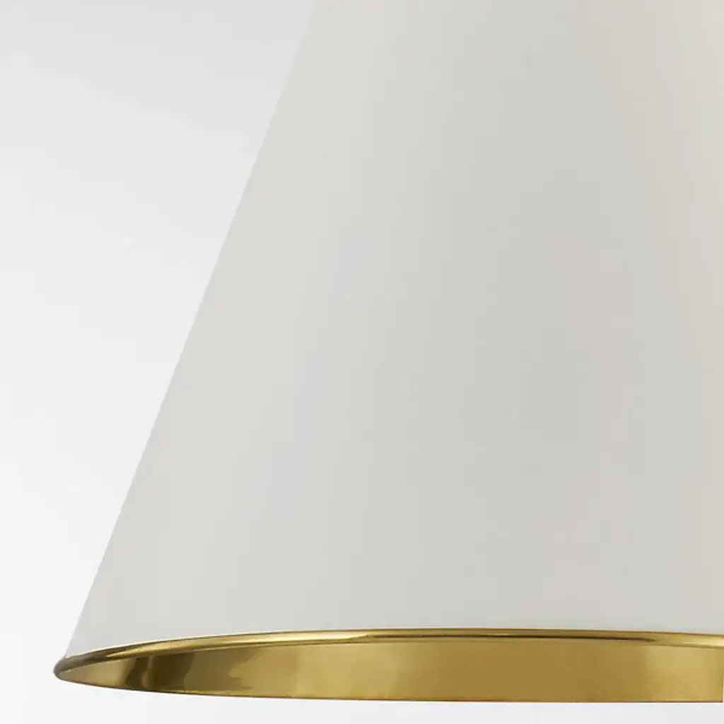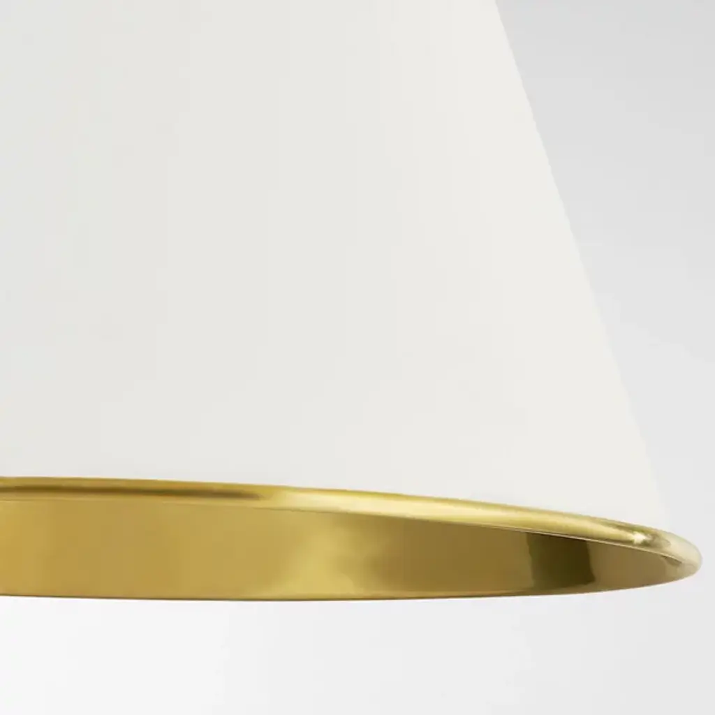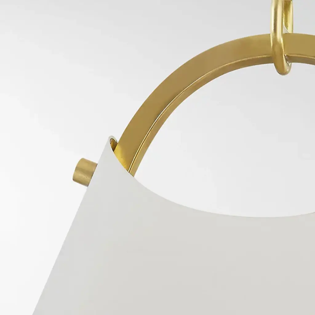 The Burnbay Pendant from Hudson Valley Lighting features a conical shade in Aged Old Bronze or Soft White and is accented by a contrasting Aged Brass interior and rolled edge detail for an unexpected take on tradition. It is paired with an AGB arched strap and jewelry-like chain, and these stylish pendants evoke a designer handbag quality that will add a fashionable element to a kitchen island, bedroom, or foyer.