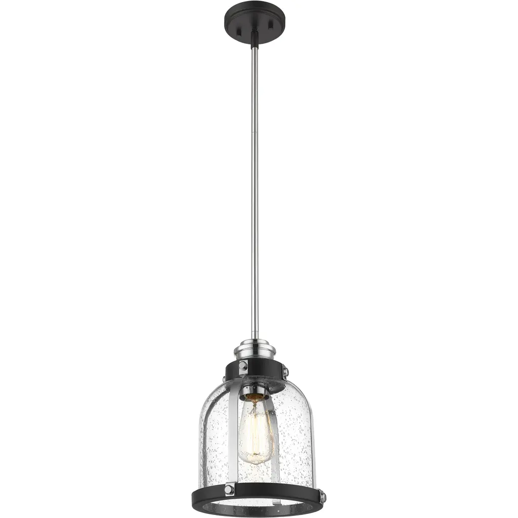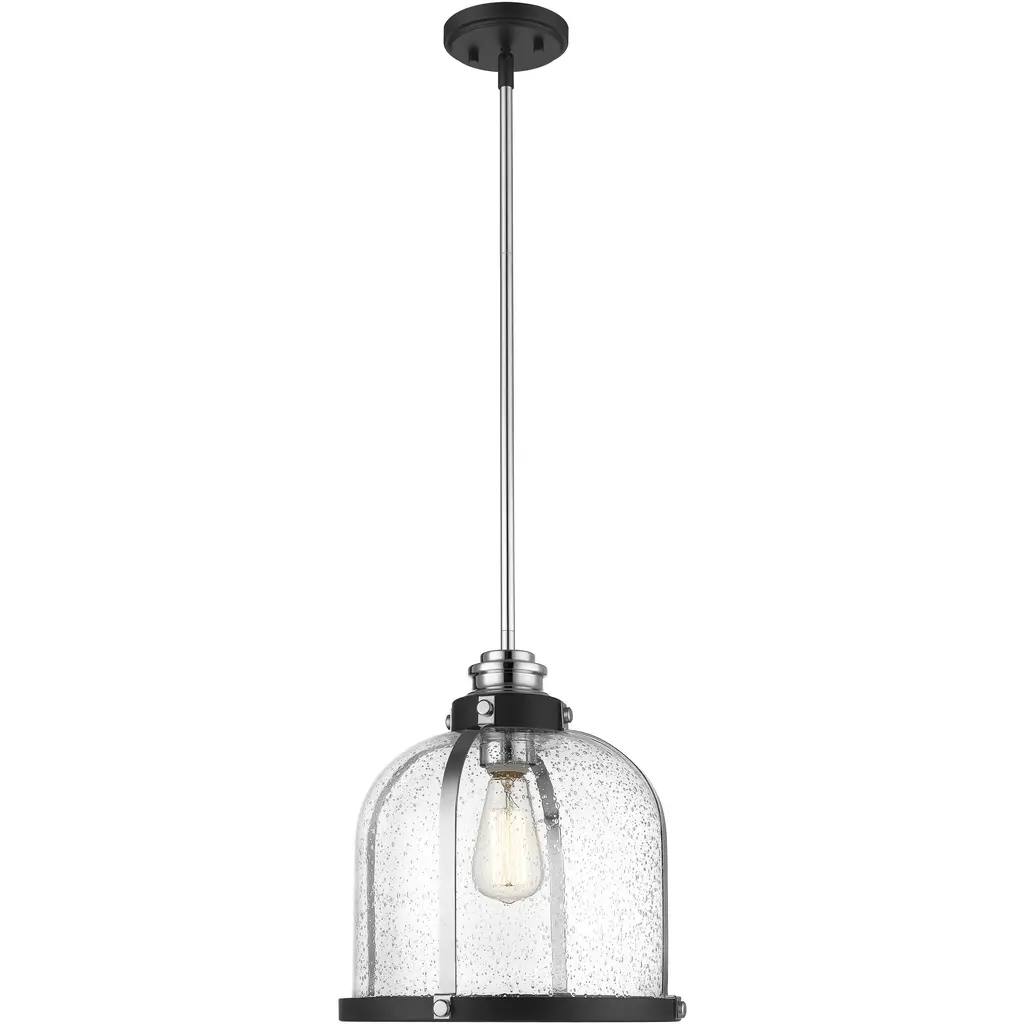Add character to a dining or living space with this matte black and chrome finish one-light pendant. Seedy glass creates an ethereal domed shade that nestles in an industrial-inspired steel frame, offering an eye-catching design element.