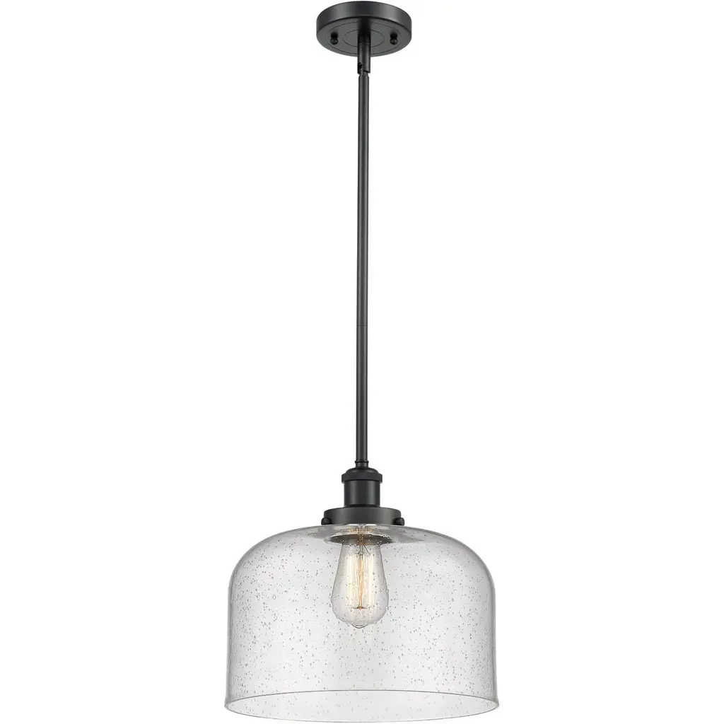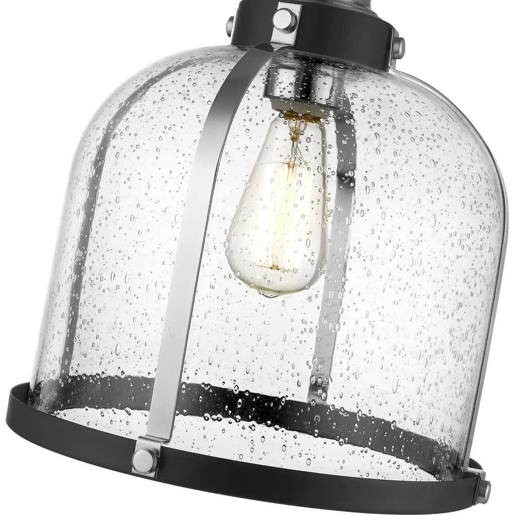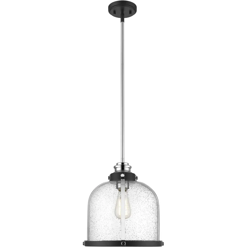 Add character to a dining or living space with this matte black and chrome finish one-light pendant. Seedy glass creates an ethereal domed shade that nestles in an industrial-inspired steel frame, offering an eye-catching design element.