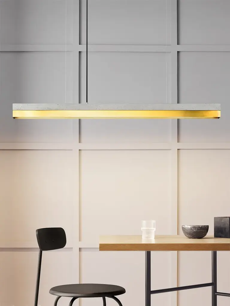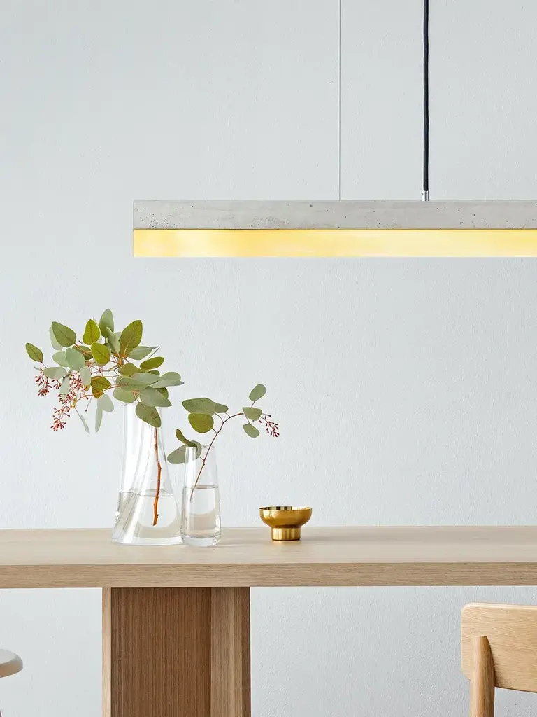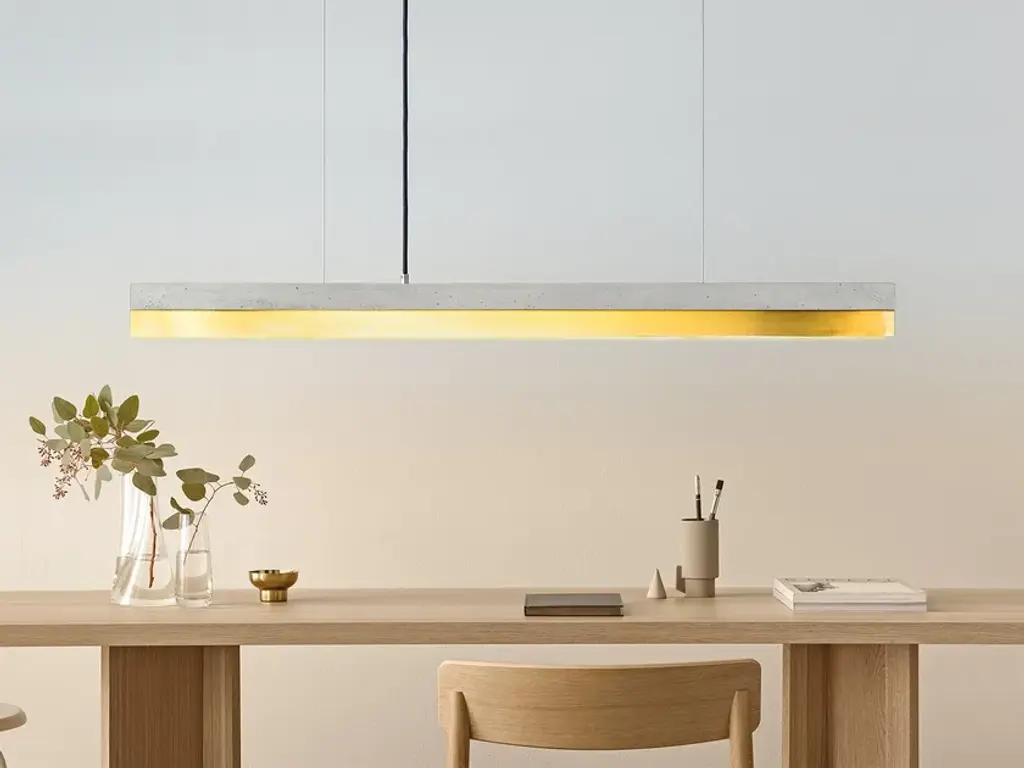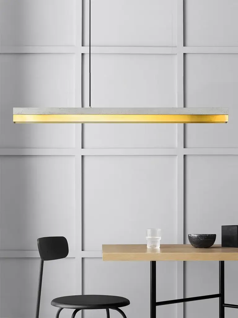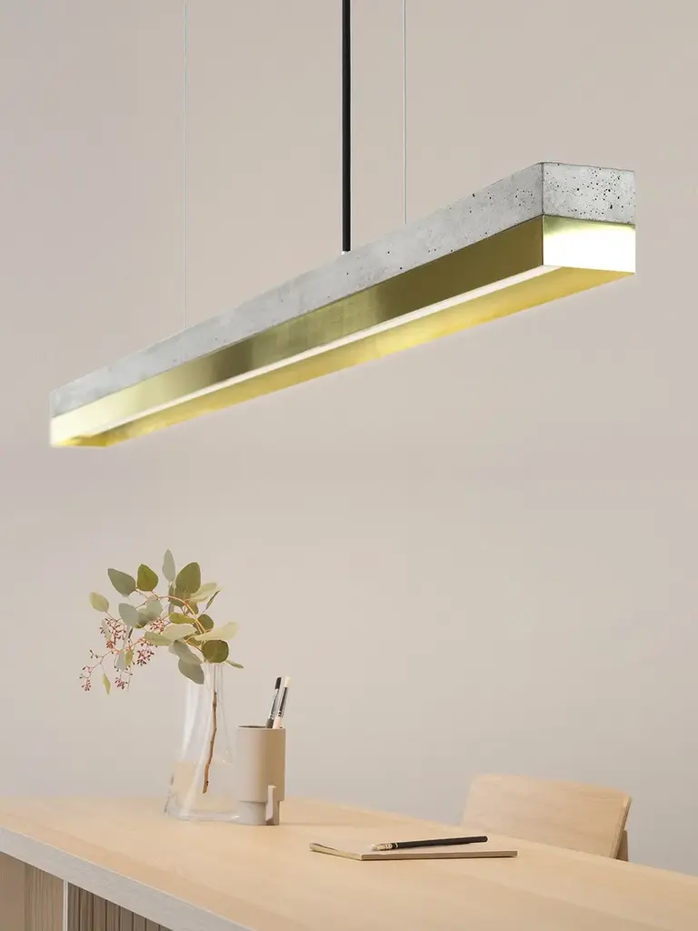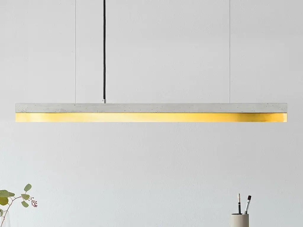 The rectangular pendant lamp [C1] BRASS merges light grey raw concrete with brass, resulting in a timeless and elegant designer light. Designed by Stefan Gant and handmade in Berlin, the light is ideally suited for illuminating a long dining table, sideboard or desk. The LED unit is available in two alternative colour temperatures: Warm white (2700 Kelvin) and cold white (4000 Kelvin). The [C] series lamps by Berlin label GANTlights received high acclaim at the European Consumers Choice Awards in 2015. Technical data: Measurements: W122cm x H8cm x D8cm Product net weight: 9kg Cable length: 2m / 3m / 5m Cable colours: Black / dark grey / whiteLight source: High quality LED unit made in Germany Dimmable: Yes Energy label: LED A++ / A+ / A Colour temperature: Warm white 2700K / Cold white 4000K Brightness: 2100lm Rated Voltage: 120-240V (50/60Hz) Watts: 25W Beam angle: 120° Power connection: Ceiling rose Ships ready to install Includes: LED strip, instructions, mounting hardware and brushed steel canopyDoes not include: Wall / ceiling plugs (anchors)
