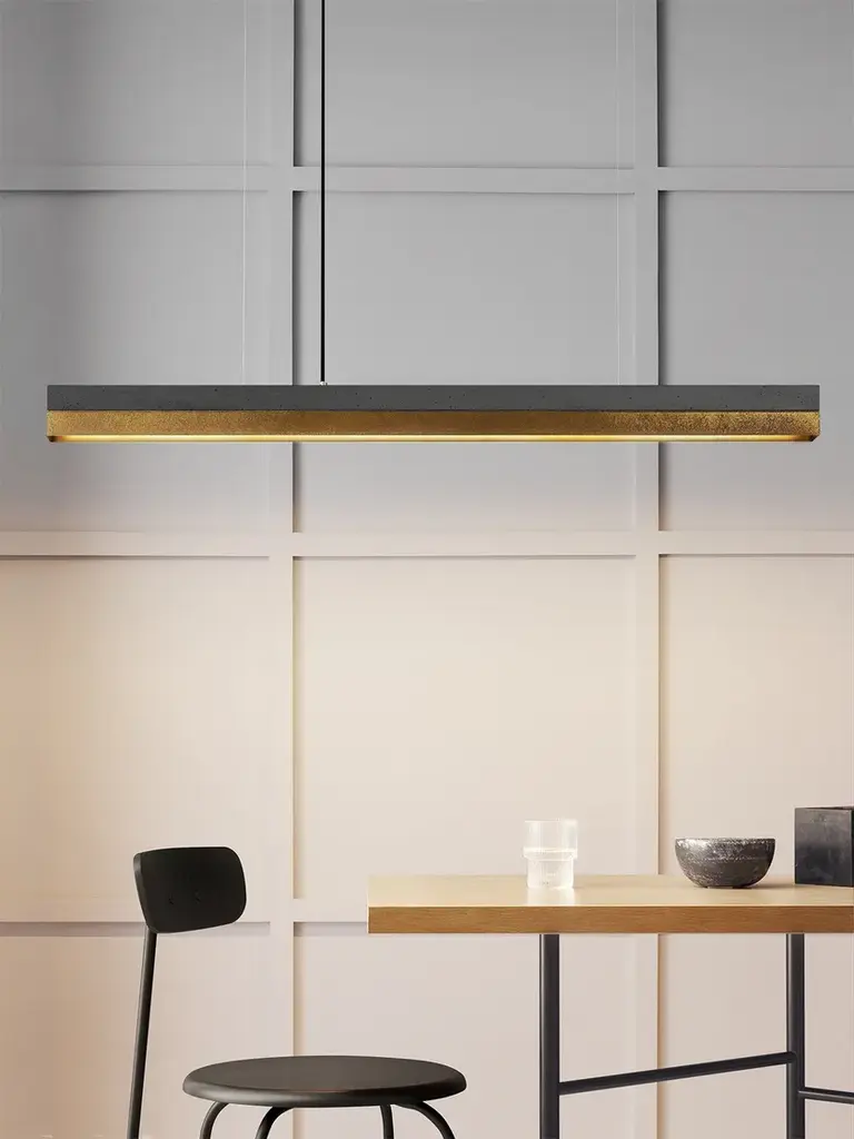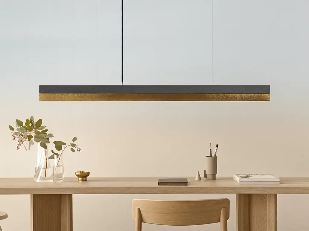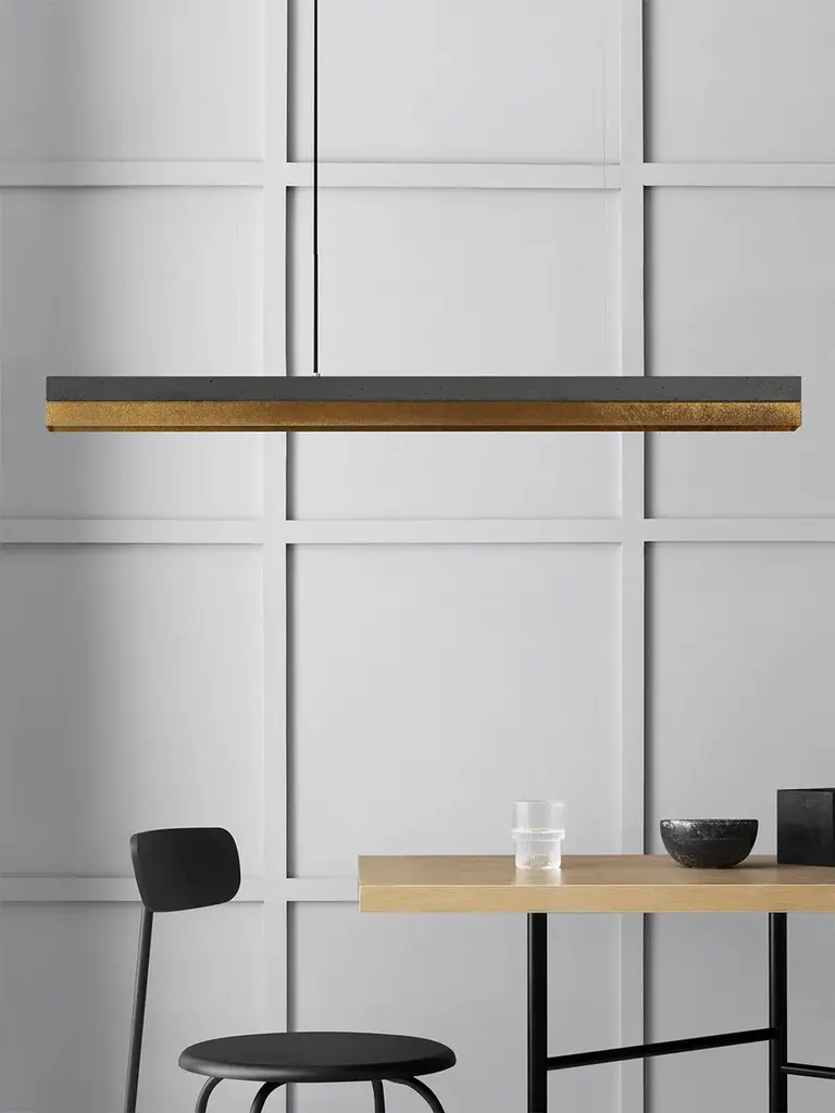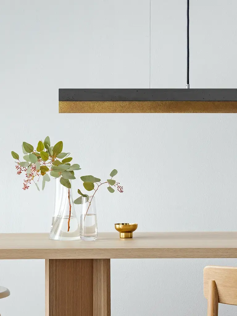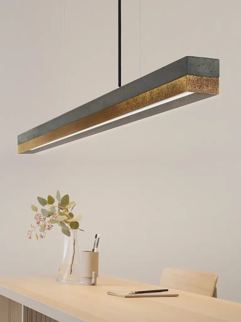 The rectangular pendant lamp [C1] OXIDISED BRASS merges concrete or wood, in the walnut or oak variant, with oxdised brass. Designed by Stefan Gant and handmade in Berlin, the light is ideally suited for illuminating a long dining table, sideboard or desk. A dimmable and non-dimmable version is available, both include a high quality LED strip made in Germany. The [C] series lamps by Berlin label GANTlights received high acclaim at the European Consumers Choice Awards in 2015.Technical data· Light source: High quality LED strip made in Germany· Dimmable: Depending on version· Beam angle: 120°· Voltaggio: 110-240V 50-60Hz