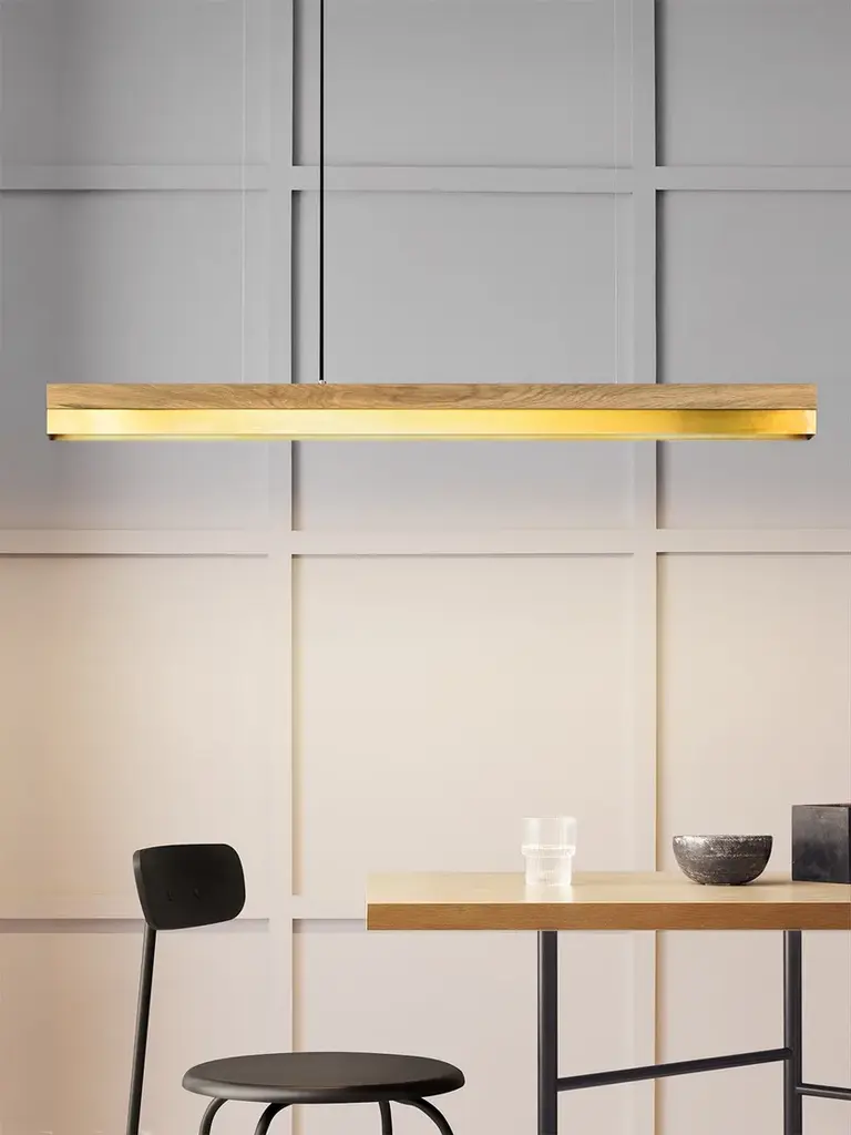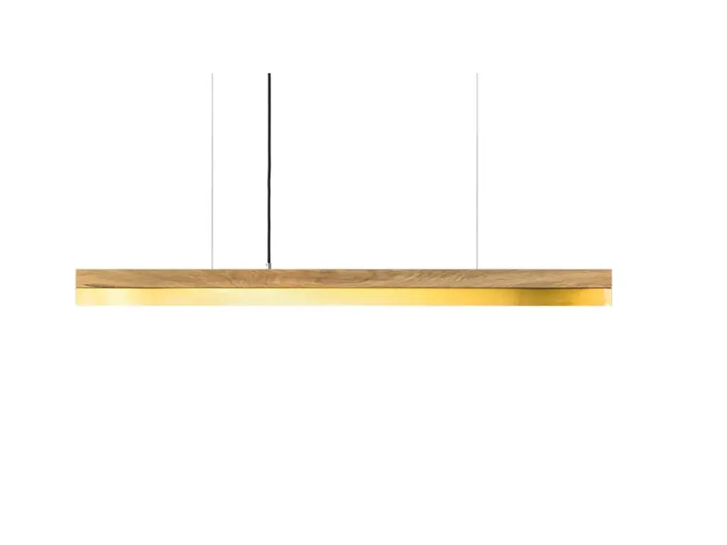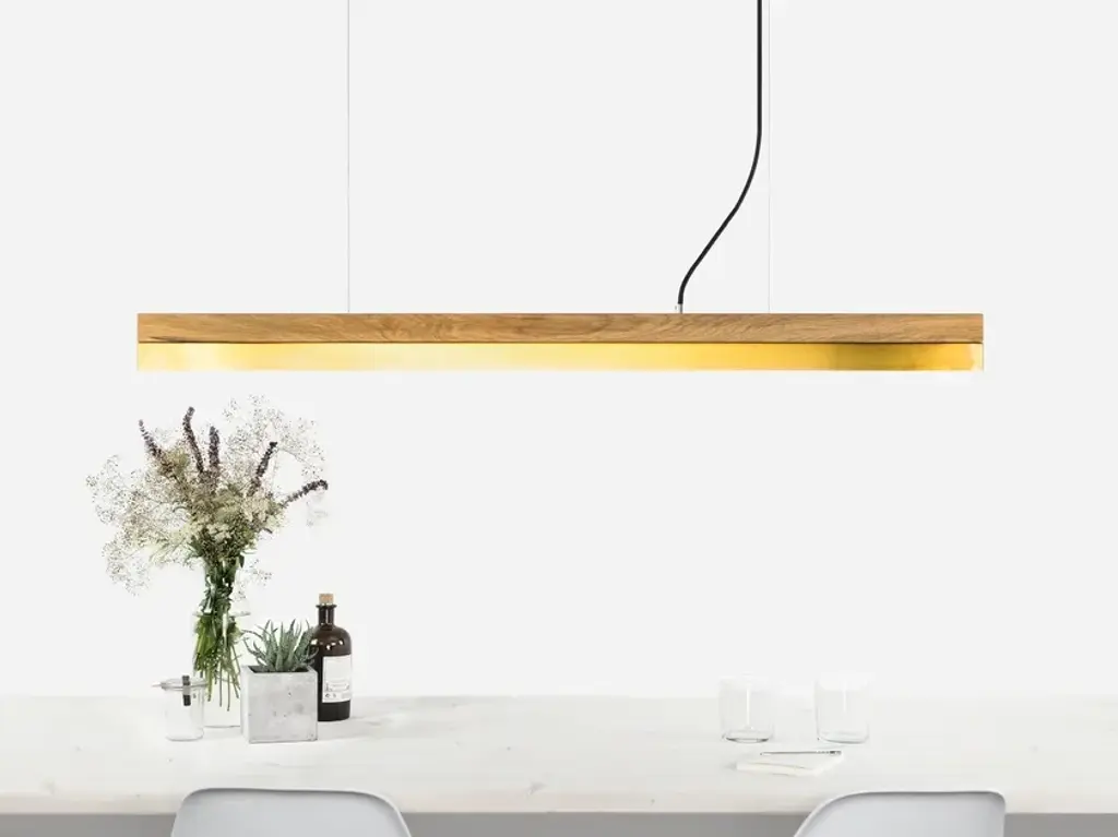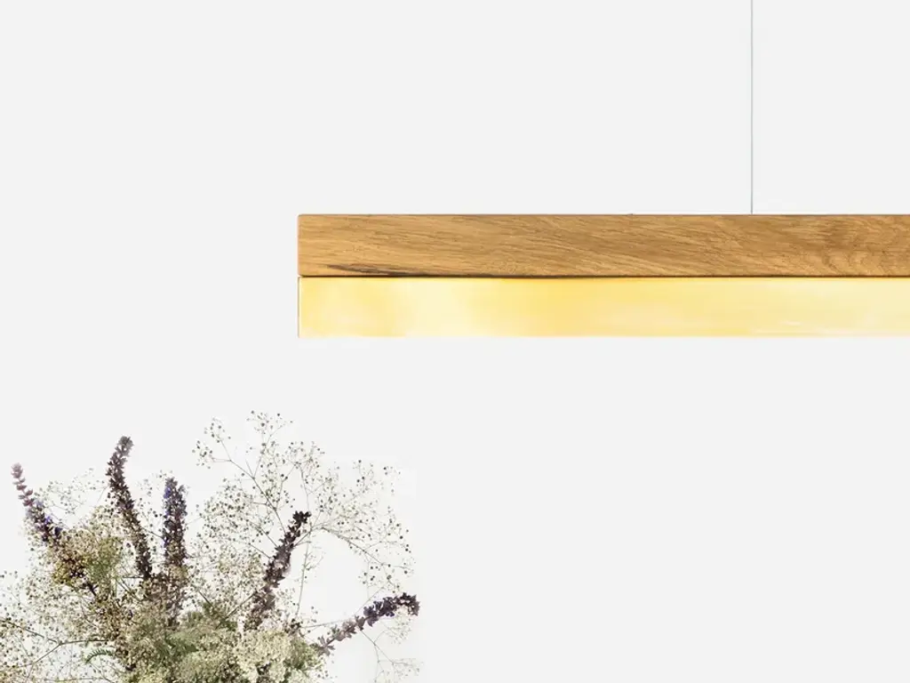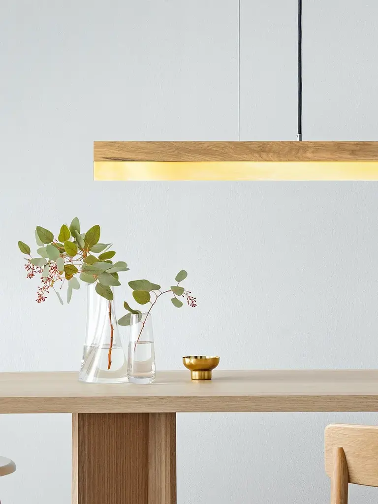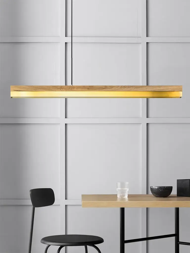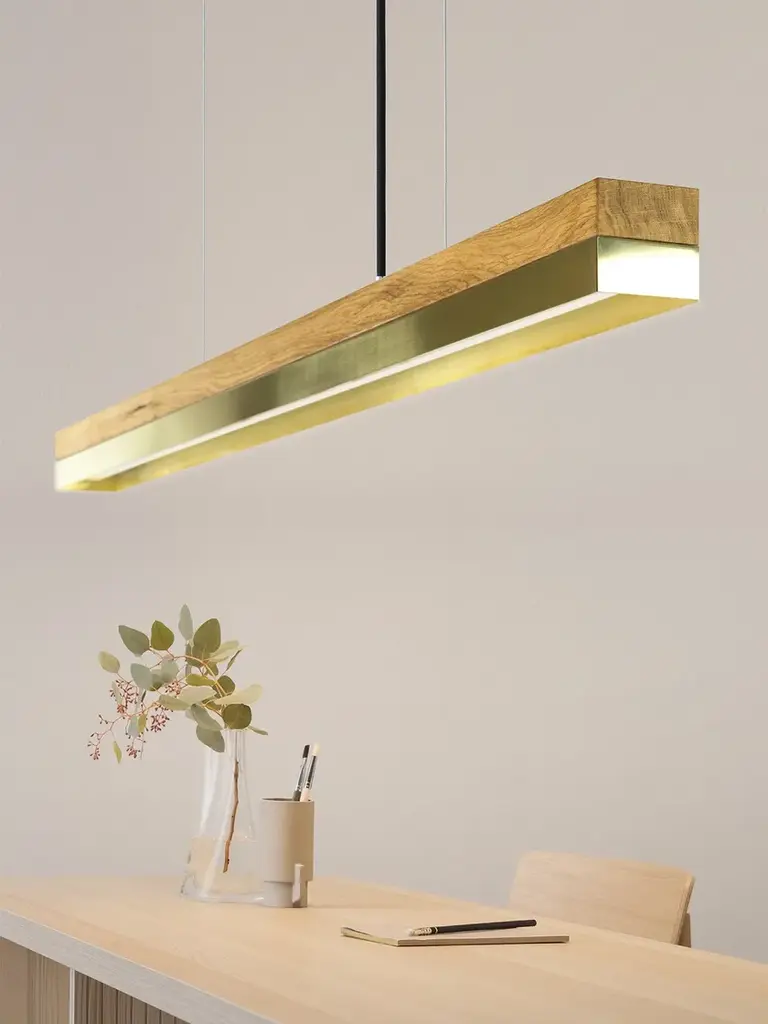 The rectangular pendant lamp [C1o] BRASS merges fine oak wood with brass, resulting in a timeless and elegant designer light.Designed by Stefan Gant and handmade in Berlin, the light is ideally suited for illuminating a dining table, desk or sideboard.The LED unit is available in two alternative colour temperatures: Warm white (2700 Kelvin) and cold white (4000 Kelvin).The [C] series lights by Berlin label GANTlights received high acclaim at the European Consumers Choice Awards in 2015.Measurements: W122cm x H8cm x D8cmProduct net weight: 4kgCable length: 2m / 3m / 5mCable colour: Black / grey / whiteLight source: High quality LED unit made in GermanyDimmable: YesEnergy label: LED A++ / A+ / AColour temperature: Warm white 2700K / Cold white 4000KBrightness: 2100lmRated Voltage: 120-240V (50/60Hz)Watts: 25WBeam angle: 120°Power connection: Ceiling rose Ships ready to installIncludes: LED unit, instructions, mounting hardware and brushed steel canopyDoes not include: Wall / ceiling plugs (anchors).
