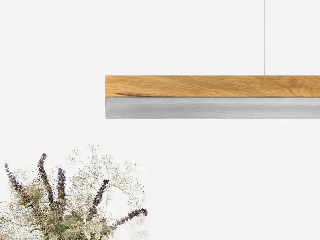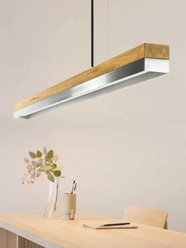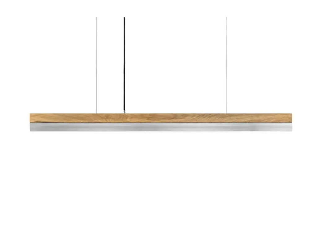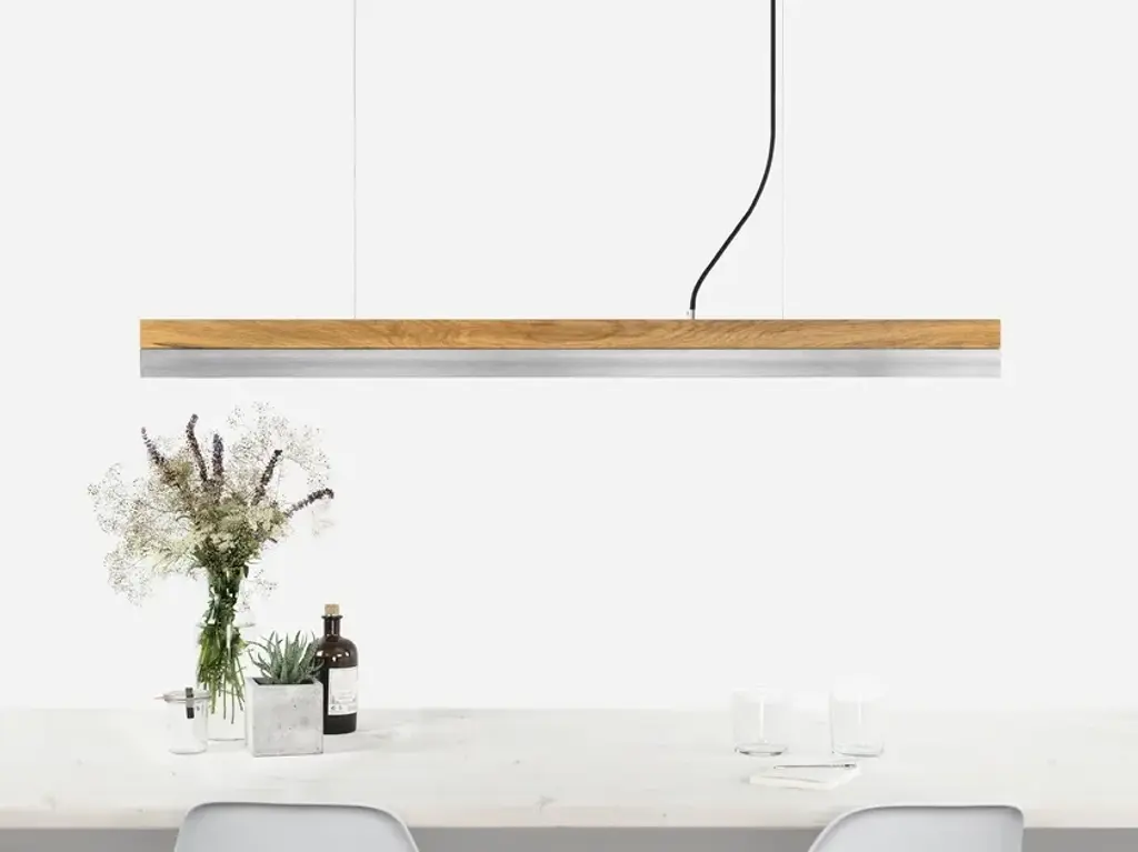 The rectangular pendant lamp [C1o] STAINLESS STEEL merges fine oak wood with stainless steel, resulting in a timeless and elegant designer light.Designed by Stefan Gant and handmade in Berlin, the light is ideally suited for illuminating a dining table, desk or sideboard.The LED unit is available in two alternative colour temperatures: Warm white (2700 Kelvin) and cold white (4000 Kelvin).The [C] series lights by Berlin label GANTlights received high acclaim at the European Consumers Choice Awards in 2015.Measurements: W122cm x H8cm x D8cmProduct net weight: 4kgCable length: 2m / 3m / 5mCable colour: Black / grey / whiteLight source: High quality LED unit made in GermanyDimmable: YesEnergy label: LED A++ / A+ / AColour temperature: Warm white 2700K / Cold white 4000KBrightness: 2100lmRated Voltage: 120-240V (50/60Hz)Watts: 25WBeam angle: 120°Power connection: Ceiling rose Ships ready to installIncludes: LED unit, instructions, mounting hardware and brushed steel canopyDoes not include: Wall / ceiling plugs (anchors).
