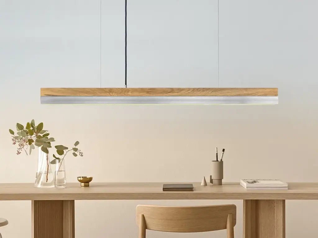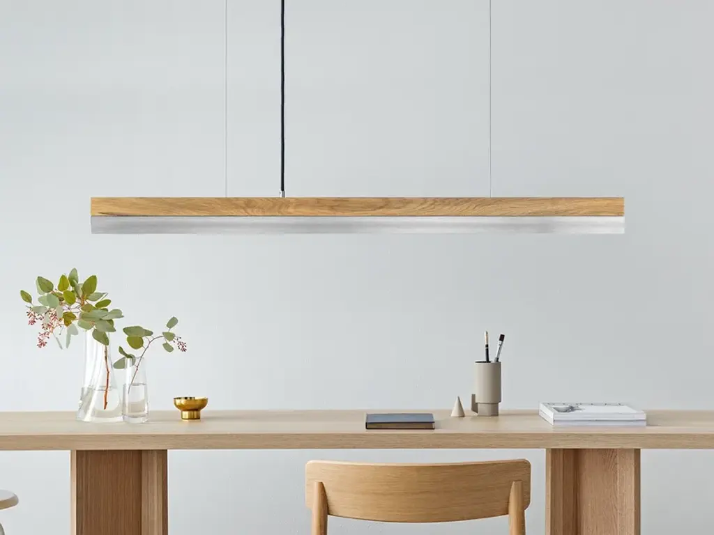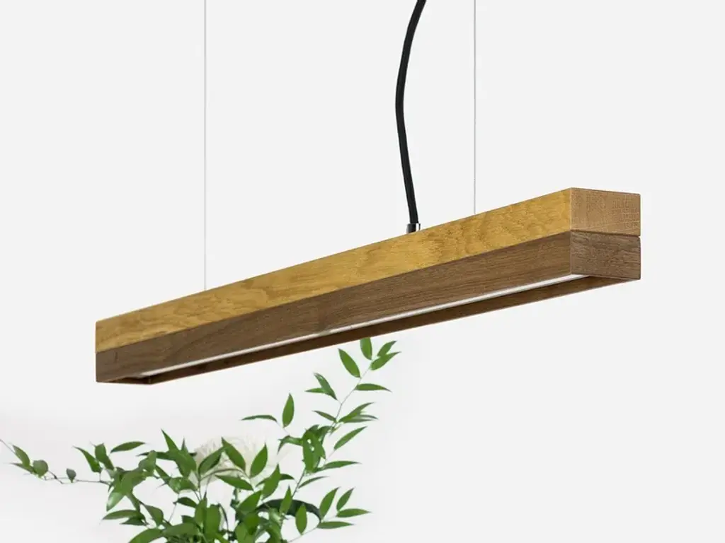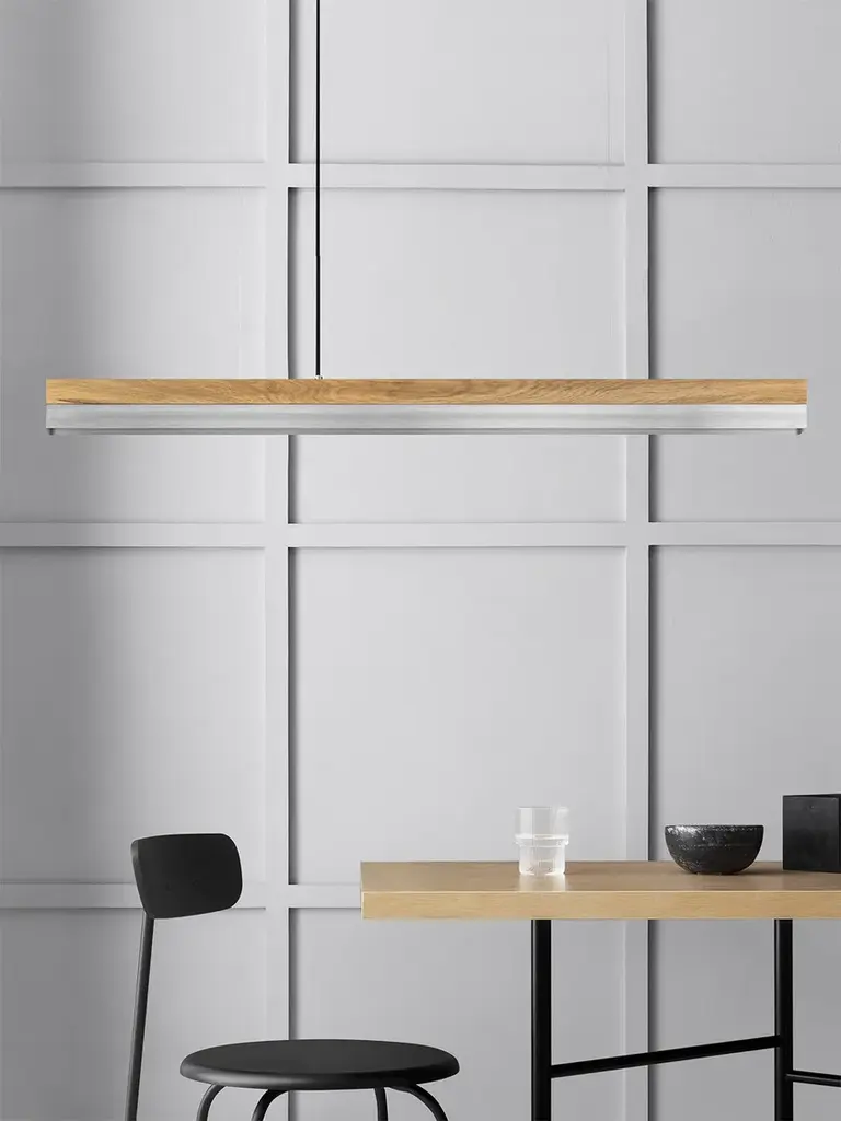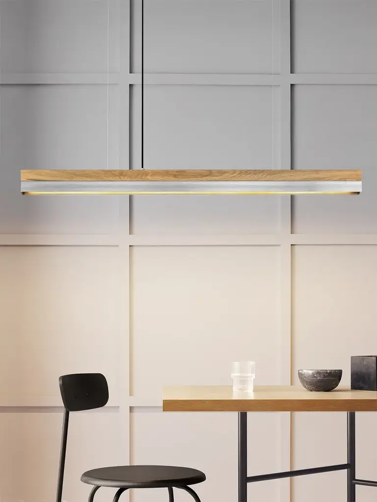 The rectangular pendant lamp [C1o] STAINLESS STEEL merges fine oak wood with stainless steel, resulting in a timeless and elegant designer light.Designed by Stefan Gant and handmade in Berlin, the light is ideally suited for illuminating a dining table, desk or sideboard.The LED unit is available in two alternative colour temperatures: Warm white (2700 Kelvin) and cold white (4000 Kelvin).The [C] series lights by Berlin label GANTlights received high acclaim at the European Consumers Choice Awards in 2015.Measurements: W122cm x H8cm x D8cmProduct net weight: 4kgCable length: 2m / 3m / 5mCable colour: Black / grey / whiteLight source: High quality LED unit made in GermanyDimmable: YesEnergy label: LED A++ / A+ / AColour temperature: Warm white 2700K / Cold white 4000KBrightness: 2100lmRated Voltage: 120-240V (50/60Hz)Watts: 25WBeam angle: 120°Power connection: Ceiling rose Ships ready to installIncludes: LED unit, instructions, mounting hardware and brushed steel canopyDoes not include: Wall / ceiling plugs (anchors).