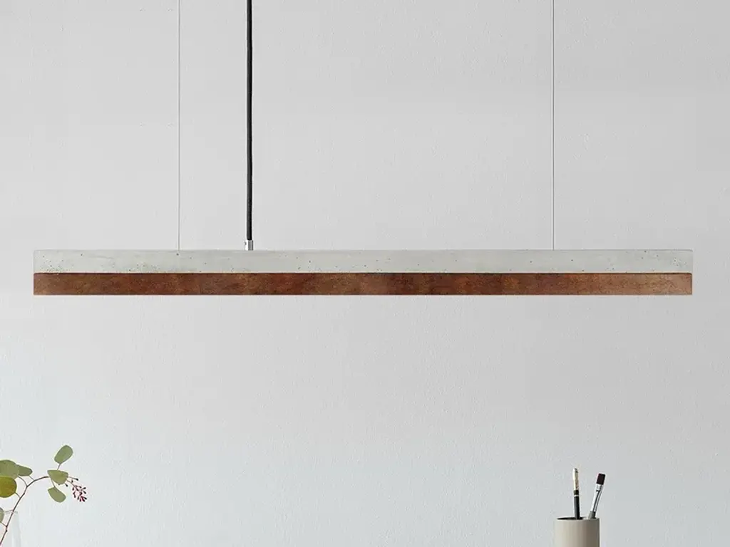 The rectangular pendant lamp [C2] OXIDISED BRASS merges concrete or wood, in the walnut or oak variant, with oxdised brass. Designed by Stefan Gant and handmade in Berlin, the light is ideally suited for illuminating a long dining table, sideboard or desk. A dimmable and non-dimmable version is available, both include a high quality LED strip made in Germany. The [C] series lamps by Berlin label GANTlights received high acclaim at the European Consumers Choice Awards in 2015.Technical data· Light source: High quality LED strip made in Germany· Dimmable: Depending on version· Beam angle: 145°· Voltaggio: 110-240V 50-60Hz