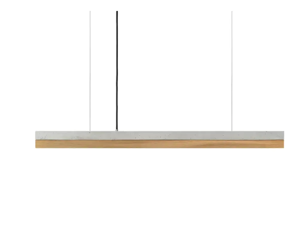 The rectangular pendant lamp [C2] OAK merges light grey concrete with fine oak wood, resulting in a timeless and elegant designer light.Designed by Stefan Gant and handmade in Berlin, the light is ideally suited for illuminating a dining table, desk or sideboard.The LED unit is available in two alternative colour temperatures: Warm white (2700 Kelvin) and cold white (4000 Kelvin).The [C] series lights by Berlin label GANTlights received high acclaim at the European Consumers Choice Awards in 2015.Measurements: W92cm x H7cm x D7cmProduct net weight: 5kgCable length: 2m / 3m / 5mCable colour: Black / grey / whiteLight source: High quality LED unit made in GermanyDimmable: YesEnergy label: LED A++ / A+ / AColour temperature: Warm white 2700K / Cold white 4000KBrightness: 2100lmRated Voltage: 120-240V (50/60Hz)Watts: 25WBeam angle: 145°Power connection: Ceiling rose Ships ready to installIncludes: LED unit, instructions, mounting hardware and brushed steel canopyDoes not include: Wall / ceiling plugs (anchors) Packaging dimensions: W100cm x H20cm x D18cmGross dispatch weight: 7.5kg