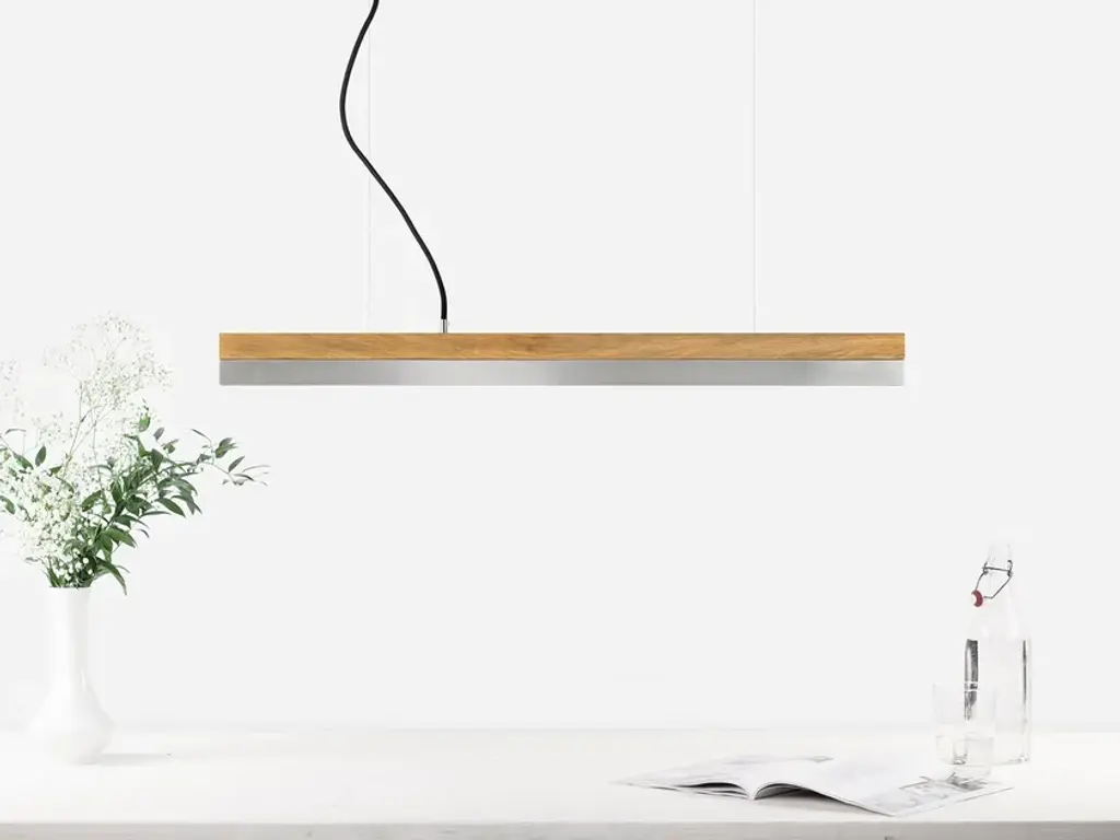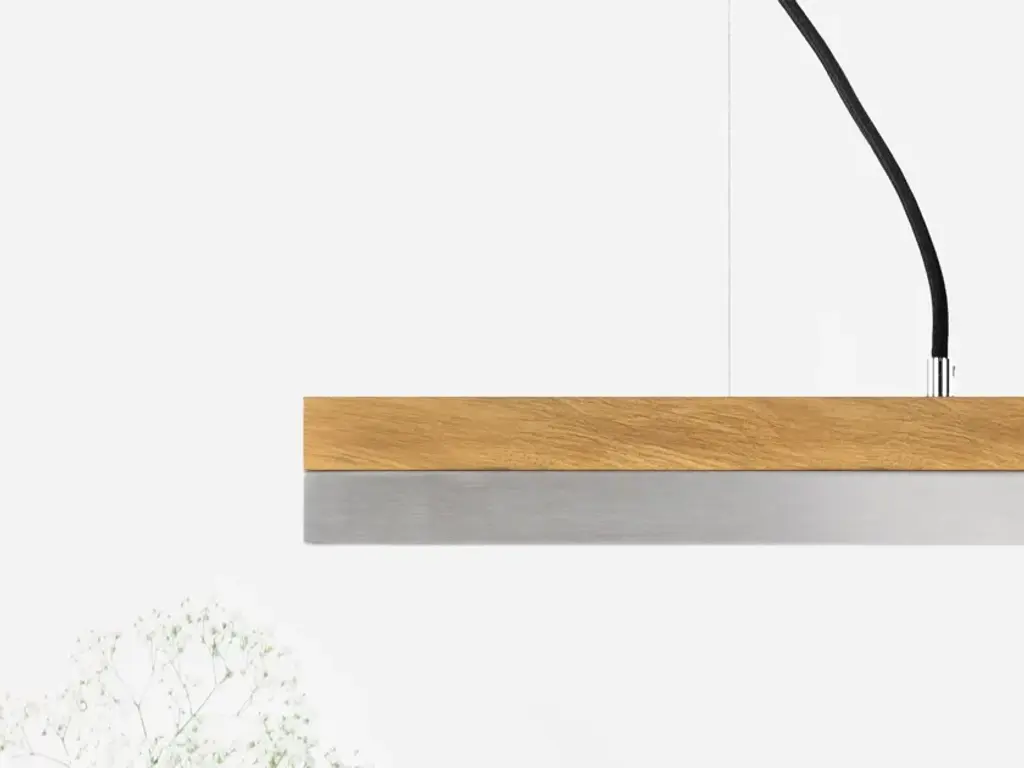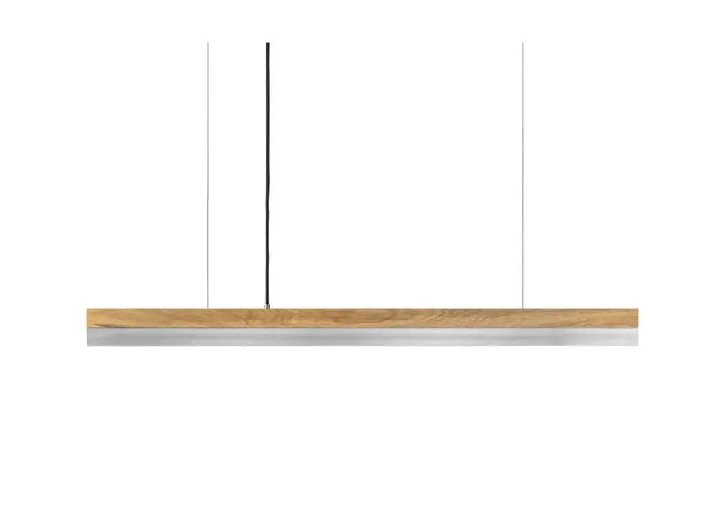 The rectangular pendant lamp [C2o] STAINLESS STEEL merges fine oak wood with stainless steel, resulting in a timeless and elegant designer light. Designed by Stefan Gant and handmade in Berlin, the light is ideally suited for illuminating a dining table, desk or sideboard. The LED unit is available in two alternative colour temperatures: Warm white (2700 Kelvin) and cold white (4000 Kelvin). The [C] series lights by Berlin label GANTlights received high acclaim at the European Consumers Choice Awards in 2015.Technical data: Measurements: W92cm x H7cm x D7cm Product net weight: 2.5kg Cable length: 2m/3m/5m Light source: High quality LED unit made in Germany Dimmable: Yes Energy label: LED A++ / A+ / A Colour temperature: Warm white 2700K / Cold white 4000K Brightness: 2100lm Rated Voltage: 120-240V (50/60Hz) Watts: 25W Beam angle: 145° Power connection: Ceiling rose Ships ready to install Includes: LED unit, instructions, mounting hardware and brushed steel canopy Does not include: Wall / ceiling plugs (anchors) Packaging dimensions: W100cm x H20cm x D18cm Gross dispatch weight: 5kgCable colour: Black / grey / white.