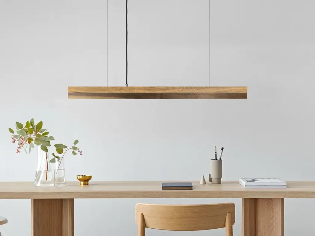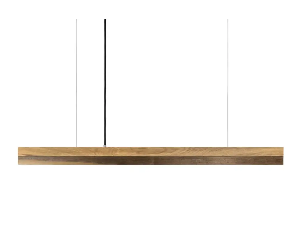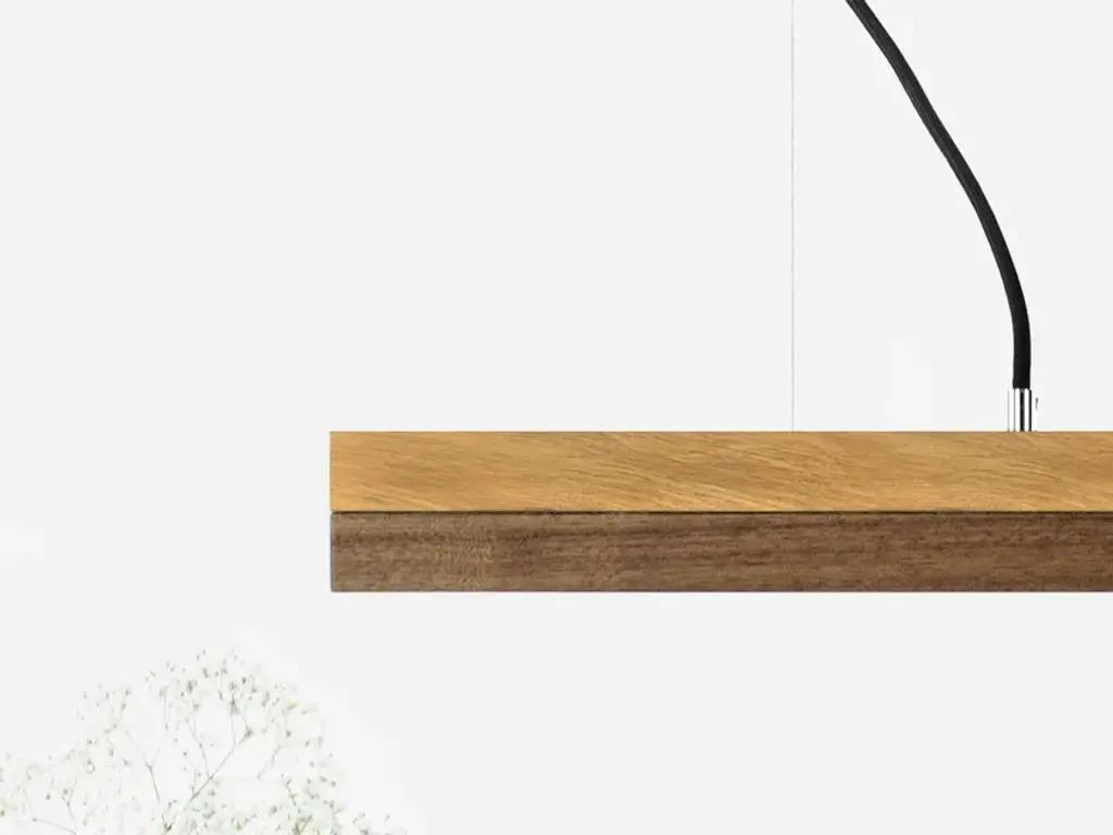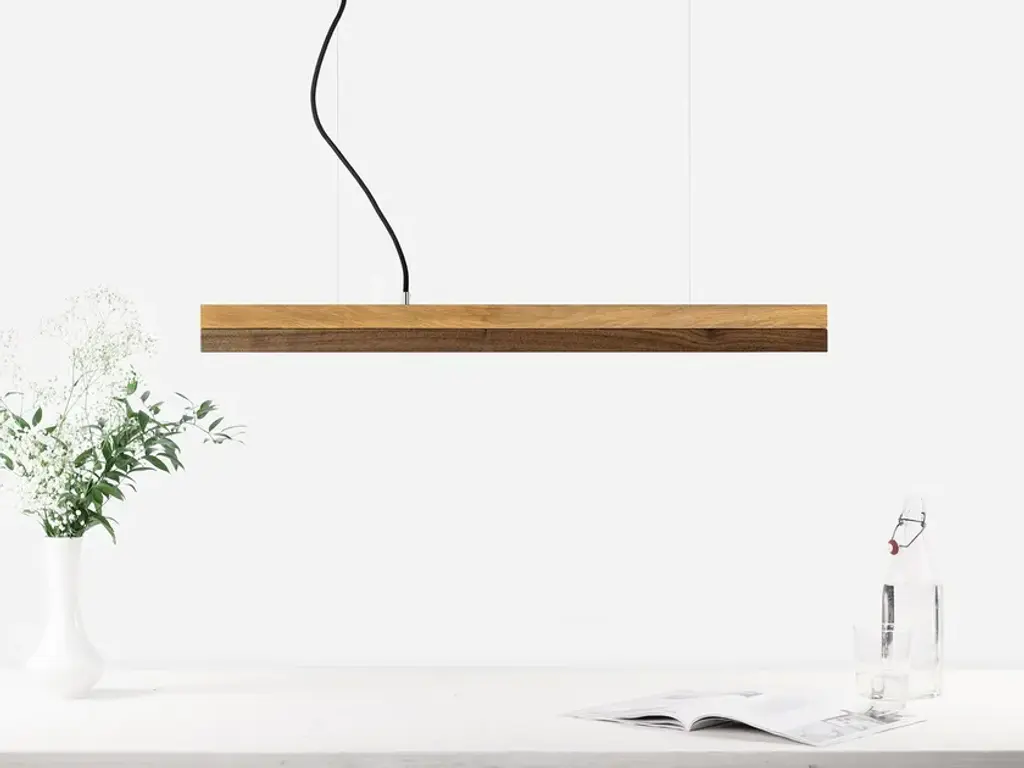 The rectangular pendant lamp [C2o] WALNUT merges fine oak wood with walnut wood, resulting in a timeless and elegant designer light. Designed by Stefan Gant and handmade in Berlin, the light is ideally suited for illuminating a dining table, desk or sideboard. The LED unit is available in two alternative colour temperatures: Warm white (2700 Kelvin) and cold white (4000 Kelvin). The [C] series lights by Berlin label GANTlights received high acclaim at the European Consumers Choice Awards in 2015.Technical data: Measurements: W92cm x H7cm x D7cm Product net weight: 2.5kg Cable length: 2m Light source: High quality LED unit made in Germany Dimmable: Yes Energy label: LED A++ / A+ / A Colour temperature: Warm white 2700K / Cold white 4000K Brightness: 2100lm Rated Voltage: 120-240V (50/60Hz) Watts: 25W Beam angle: 145° Power connection: Ceiling rose Ships ready to install Includes: LED unit, instructions, mounting hardware and brushed steel canopy Does not include: Wall / ceiling plugs (anchors) Packaging dimensions: W100cm x H20cm x D18cm Gross dispatch weight: 5kgCable colour: Black / grey / white