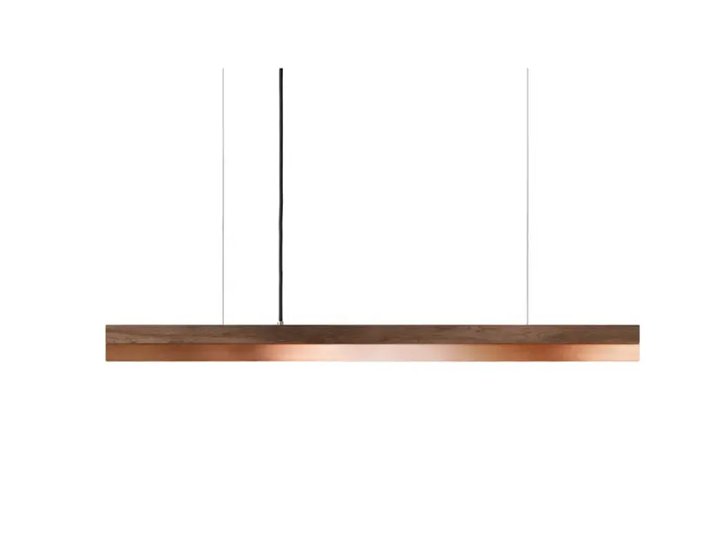 The rectangular pendant lamp [C2w] COPPER merges fine walnut wood with copper, resulting in a timeless and elegant designer light. Designed by Stefan Gant and handmade in Berlin, the light is ideally suited for illuminating a dining table, desk or sideboard.The LED unit is available in two alternative colour temperatures: Warm white (2700 Kelvin) and cold white (4000 Kelvin).The [C] series lights by Berlin label GANTlights received high acclaim at the European Consumers Choice Awards in 2015.Technical data:Measurements: W92cm x H7cm x D7cmCable length: 1.8 m / 3 m / 5mLight source: High quality LED unit made in GermanyDimmable: YesEnergy label: LED A++ / A+ / AColour temperature: Warm white 2700K / Cold white 4000KBrightness: 2100lmRated Voltage: 120-240V (50/60Hz)Watts: 25WBeam angle: 145°Power connection: Ceiling roseShips ready to installIncludes: LED unit, instructions, mounting hardware and brushed steel canopyDoes not include: Wall / ceiling plugs (anchors)Packaging dimensions: W100cm x H20cm x D18cmCable colour: Black / Light grey / Graphite grey /white