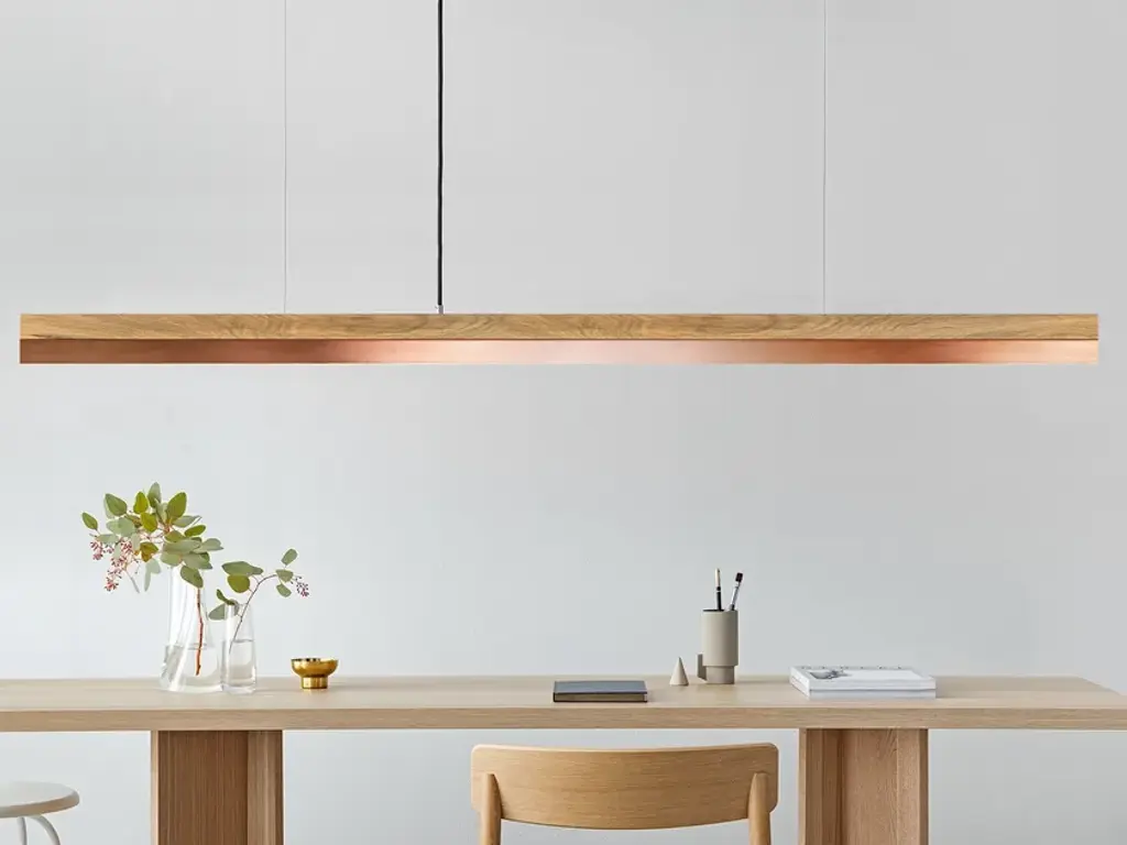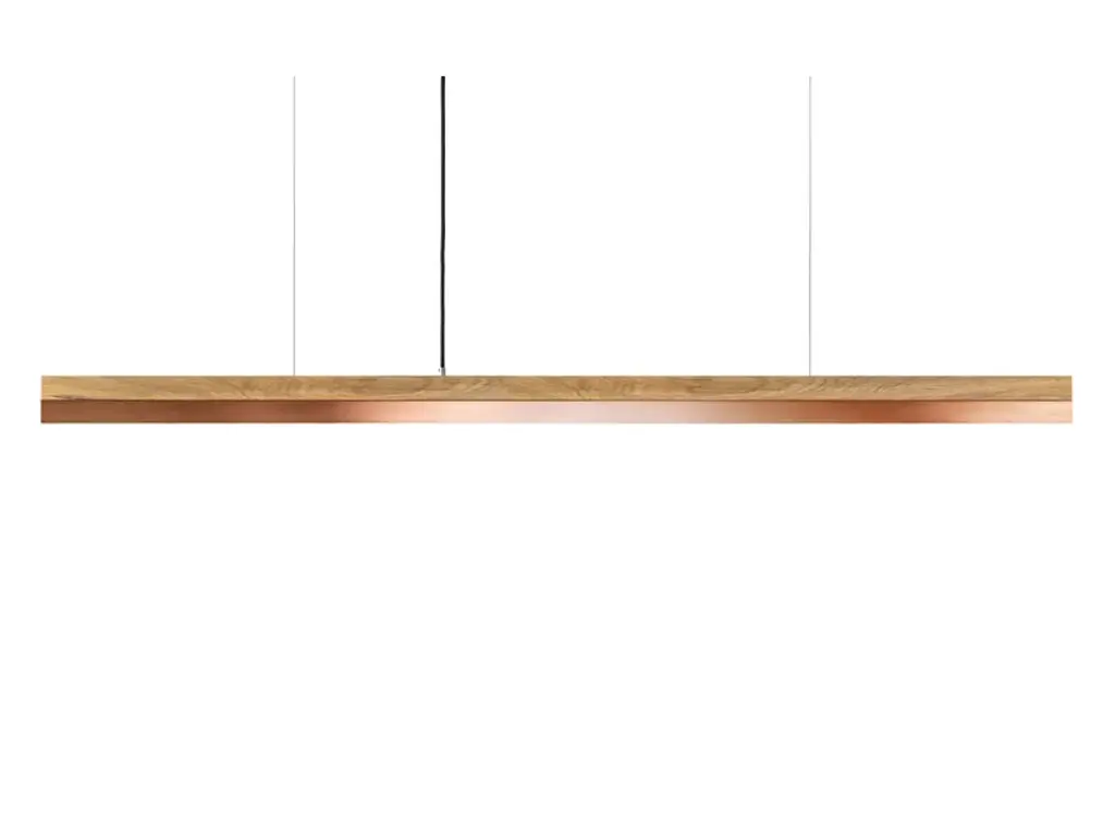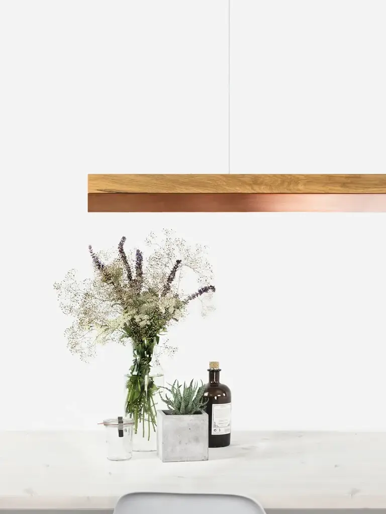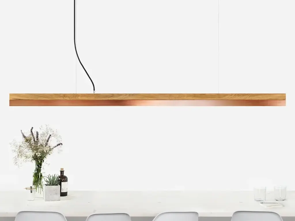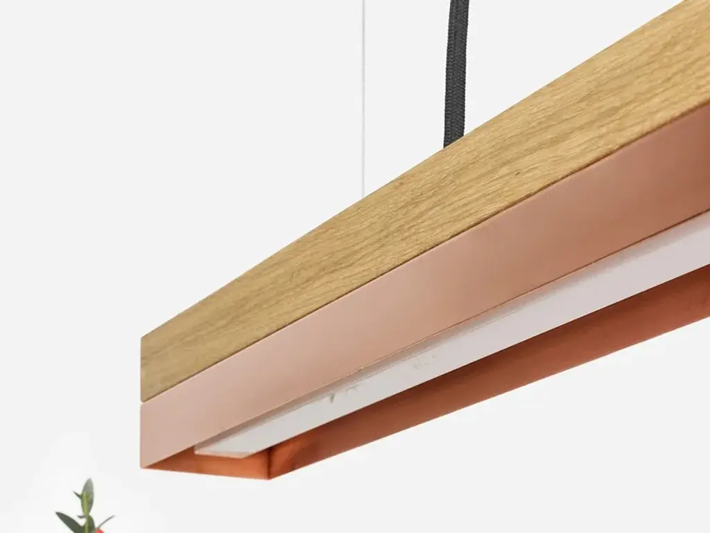 The rectangular pendant lamp [C3o] COPPER merges fine oak wood with copper, resulting in a timeless and elegant designer light.Designed by Stefan Gant and handmade in Berlin, the light is ideally suited for illuminating a dining table, desk or sideboard.The LED unit is available in two alternative colour temperatures: Warm white (2700 Kelvin) and cold white (4000 Kelvin).The [C] series lights by Berlin label GANTlights received high acclaim at the European Consumers Choice Awards in 2015.Measurements: W182cm x H8cm x D8cmProduct net weight: 6kgCable length: 2m / 3m / 5mCable colour: Black / grey / whiteLight source: High quality LED unit made in GermanyDimmable: YesEnergy label: LED A++ / A+ / AColour temperature: Warm white 2700K / Cold white 4000KBrightness: 2600lmRated Voltage: 120-240V (50/60Hz)Watts: 30WBeam angle: 120°Power connection: Ceiling rose Ships ready to installIncludes: LED unit, instructions, mounting hardware and brushed steel canopyDoes not include: Wall / ceiling plugs (anchors)
