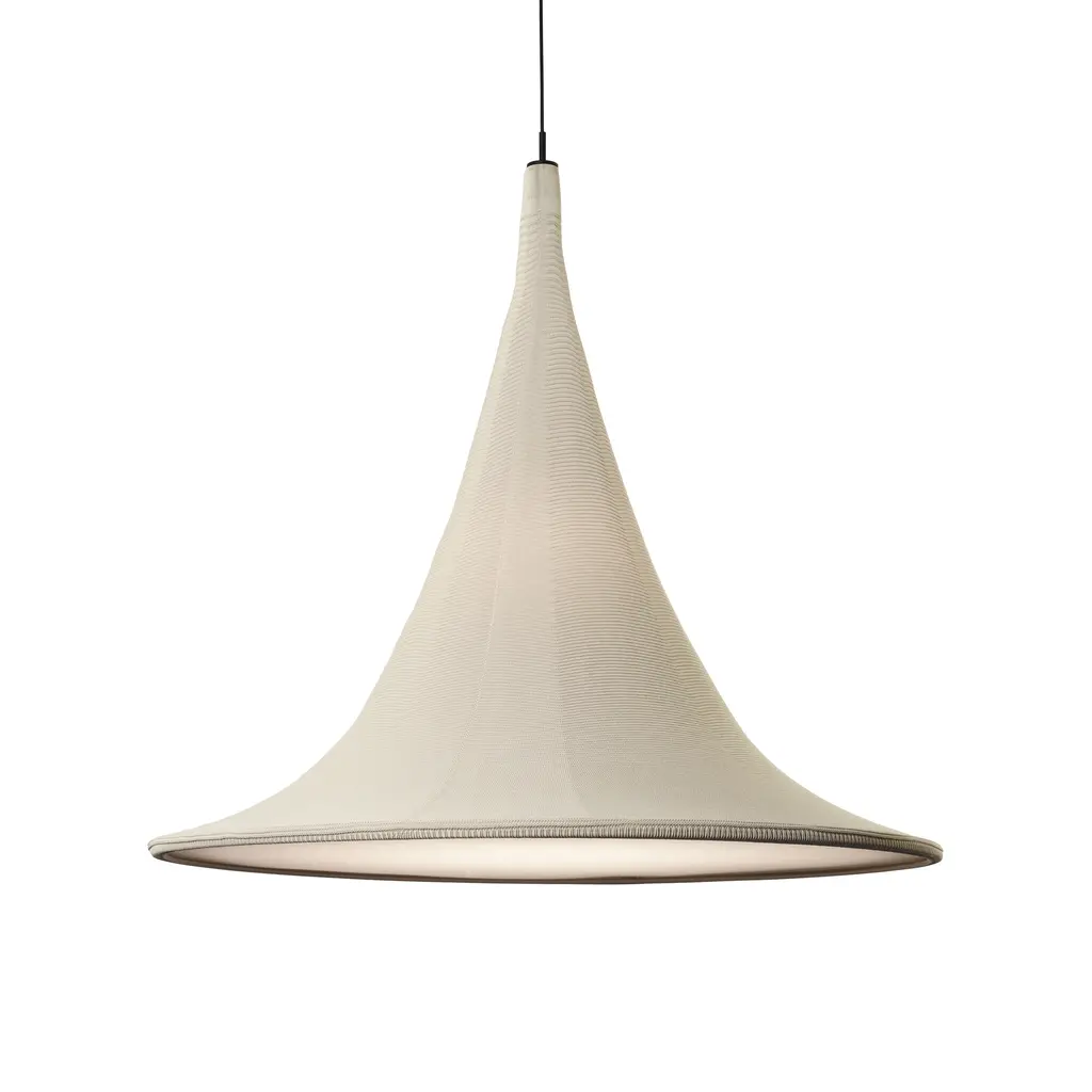 Inspired by Galician cabins, the Cabana Pendant Light from a-emotional light brings geometric beauty to your home. Casting artisanal illumination with a conical shade of 3D Knitted Fabric, a parchment diffuser holds its shape, while softening the light for a warm, welcoming ambiance. Highlights