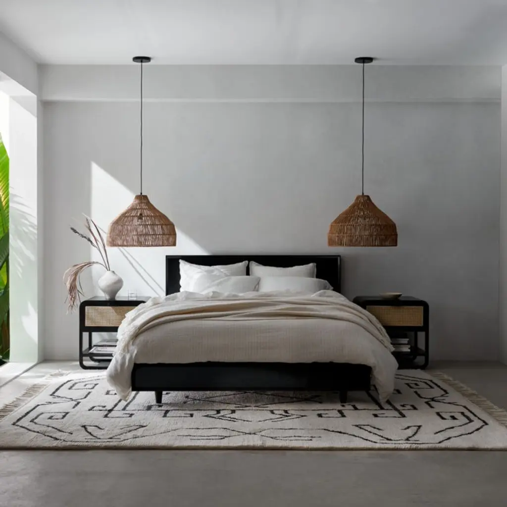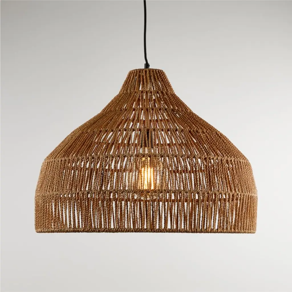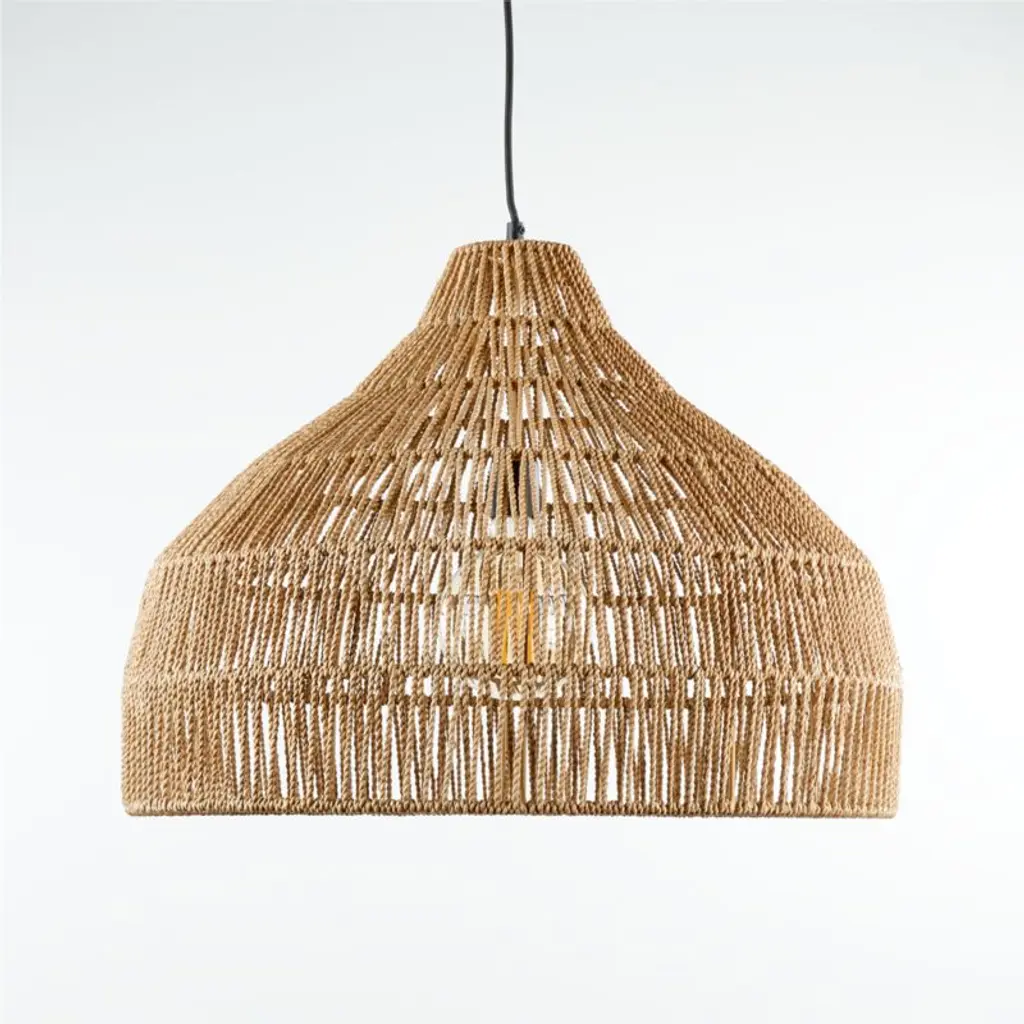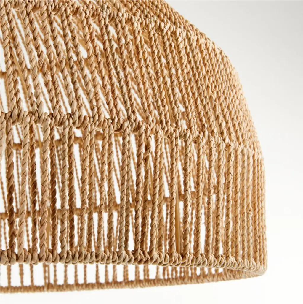 Natural rope weaves a large pendant light with a touch of the tropics. Brown rope loops in a zigzag pattern over a neutral metal frame the classic angles of a farmhouse shade. The chunky fiber and loose weave allow light to filter through, creating bright and diffuse illumination. Show off your favorite display-worthy bulb, or choose an understated light bulb to keep the focus on the natural material and modern organic shade. Our large Cabo woven pendant light is a Crate and Barrel exclusive.
