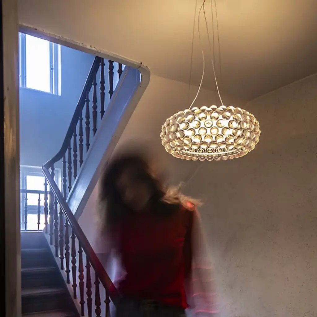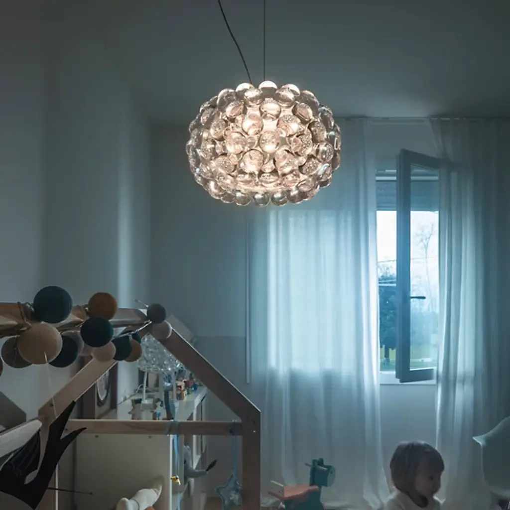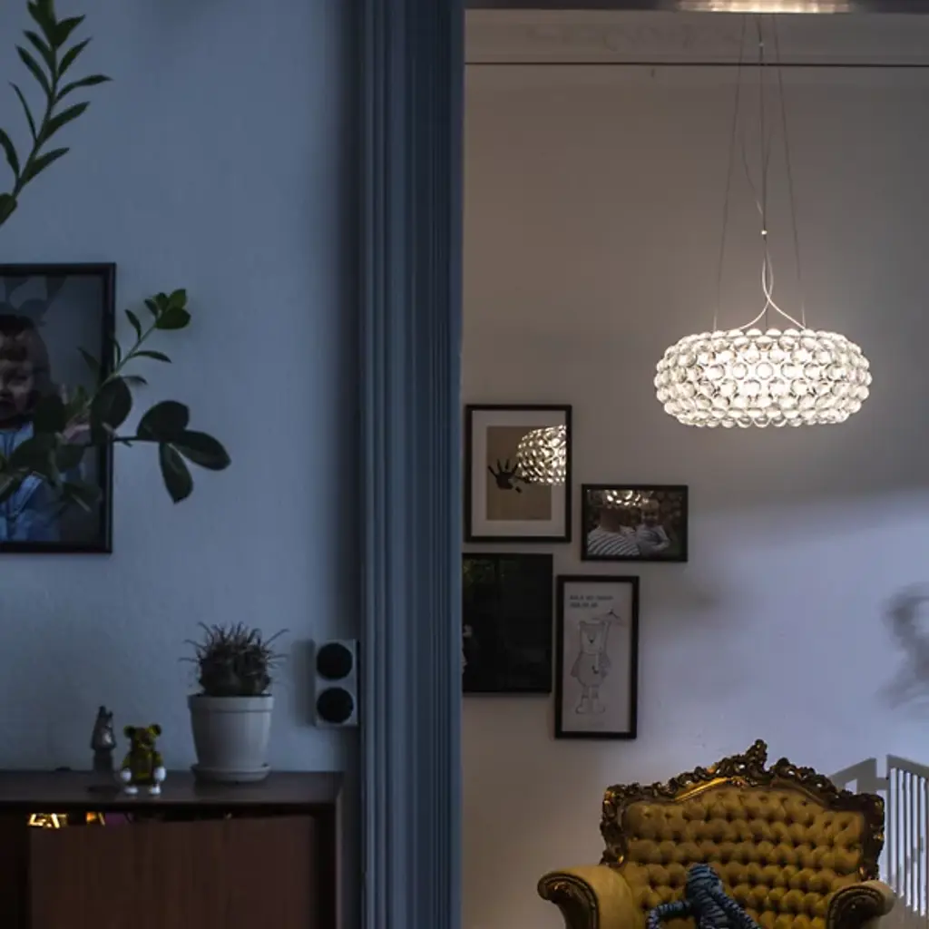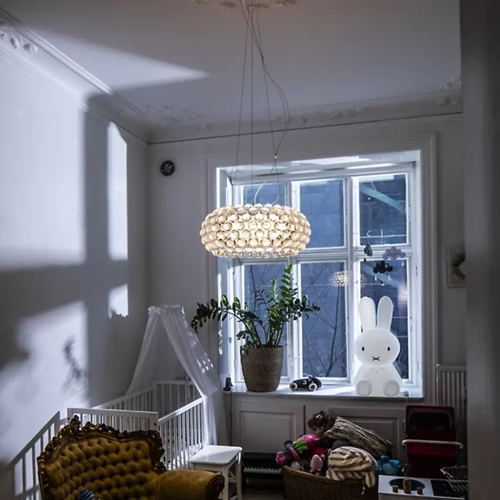 The Foscarini Caboche Plus Pendant is as ornamental as jewelry, with intricate blown glass facets that capture and replicate the bright light source inside. Highly decorative yet completely functional, the fixture produces significant down and up light along with the glassy reflective light through the acrylic facets. The new LED technology is sophisticated and re-engineered to produce the same diffusion and light temperature as the original Caboche Suspension.