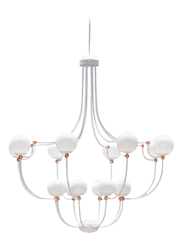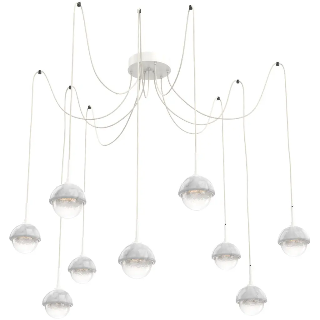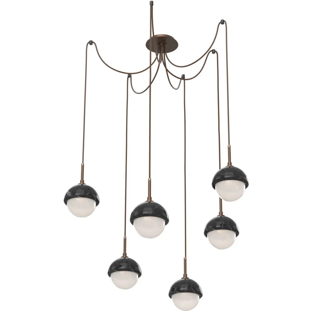 Capturing the visual intrigue of a time-honored gemstone style, this versatile chandelier enables customization of the placement and height of each pendant. Each Pebble is a sculptural fusion of polished stone, artisan blown crystal glass and metalwork. Integrated LED light illuminates each glass shade without the distraction of a filament bulb. Available in several glass colors, stone styles and finishes.