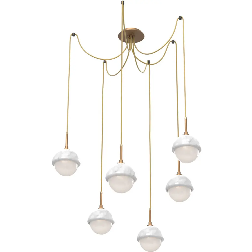 Cabochon Led 14.1 Inch Novel Brass With White Marble Swag Multi-Pendant Ceiling Light In 2700k Led, Opal White