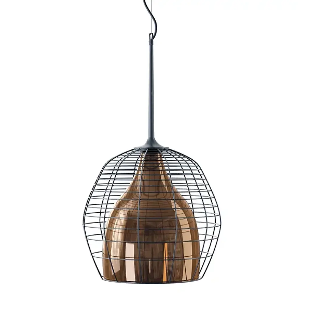 Add a touch of urban industrial style to the décor of your modern home with the Cage Pendant from Diesel Living with LODES. Hanging from a single thin downrod, this piece consists of a wide, metal wire cage that gently wraps around a bulbous blown glass diffuser. The mouth opening at the base reveals the light from the single bulb within. A warm and even glow lightly decorates the space below, creating a remarkable ambiance.