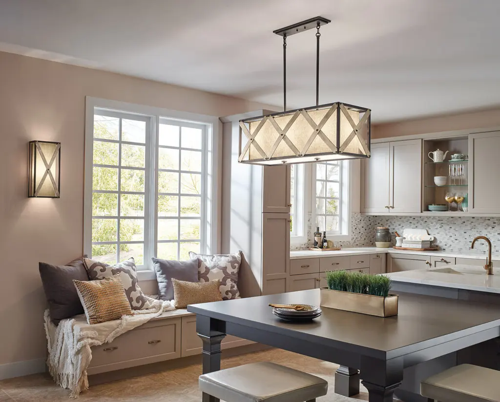 This rustic 3 light linear chandelier from the Cahoon collection incorporates natural materials and colors to create a subtle and beautiful aesthetic. The Anvil Iron finish coupled with Distressed Antique Grey accents are the perfect compliment to the beige linen shades.